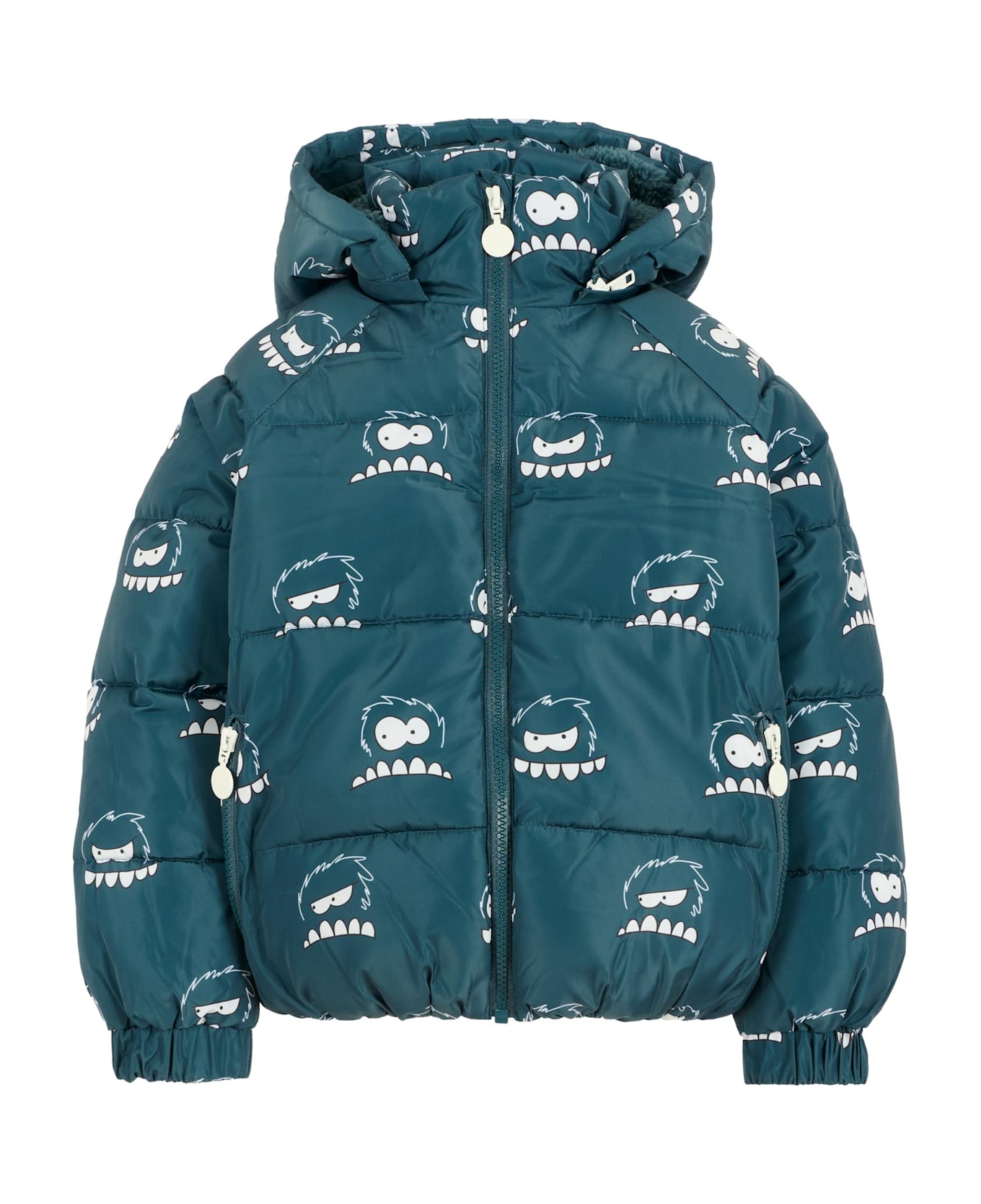 Heavyweight blue down jacket in recycled polyester, padded and quilted, with a soft faux fur lining, long sleeves with a removable hood, a front zip fastening, side zip pockets, and elasticated cuffs and hem. It is embellished with an all-over Yeti print.