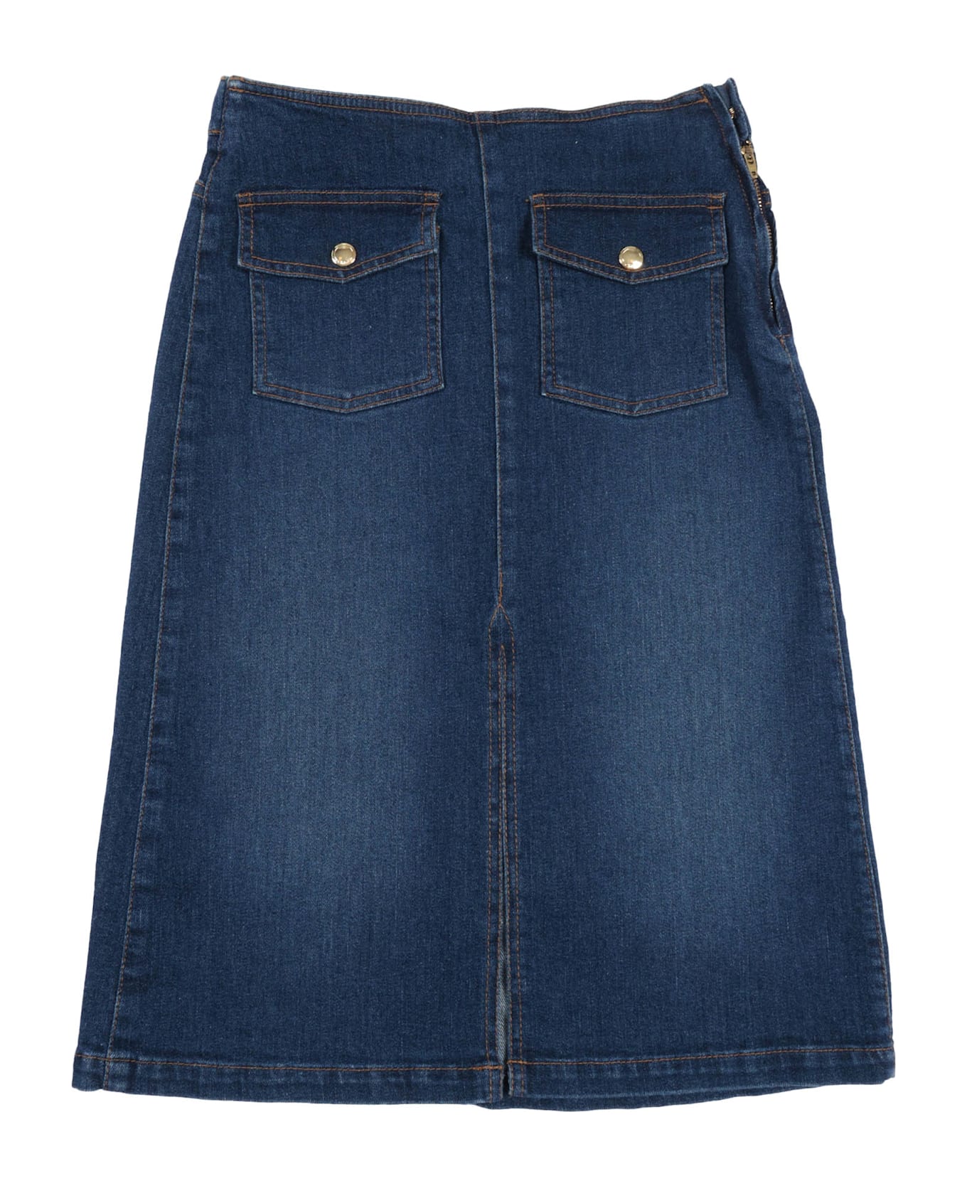 Mid-length denim skirt with patch pockets and slit on front, leather label on back with Chlo Paris embossed branding (cow leather, source: Italy, wet-white chrome free tanning), adjustable waist with inside elastic band up to 12Y. Inspired from Womenswear. Composition: 100% COTTON FABRIC 2 99% COTTON 1% ELASTANE