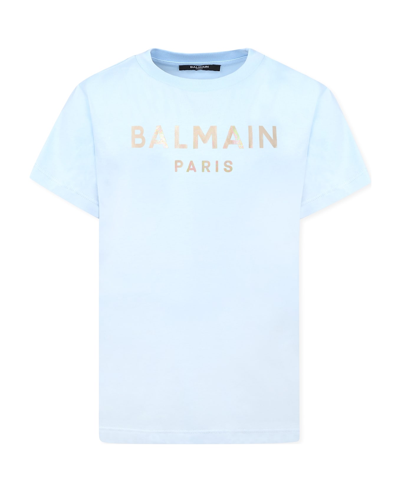 Light blue organic cotton t-shirt with short sleeves and ribbed crew neck. It is embellished with iridescent Balmain logo on the front.