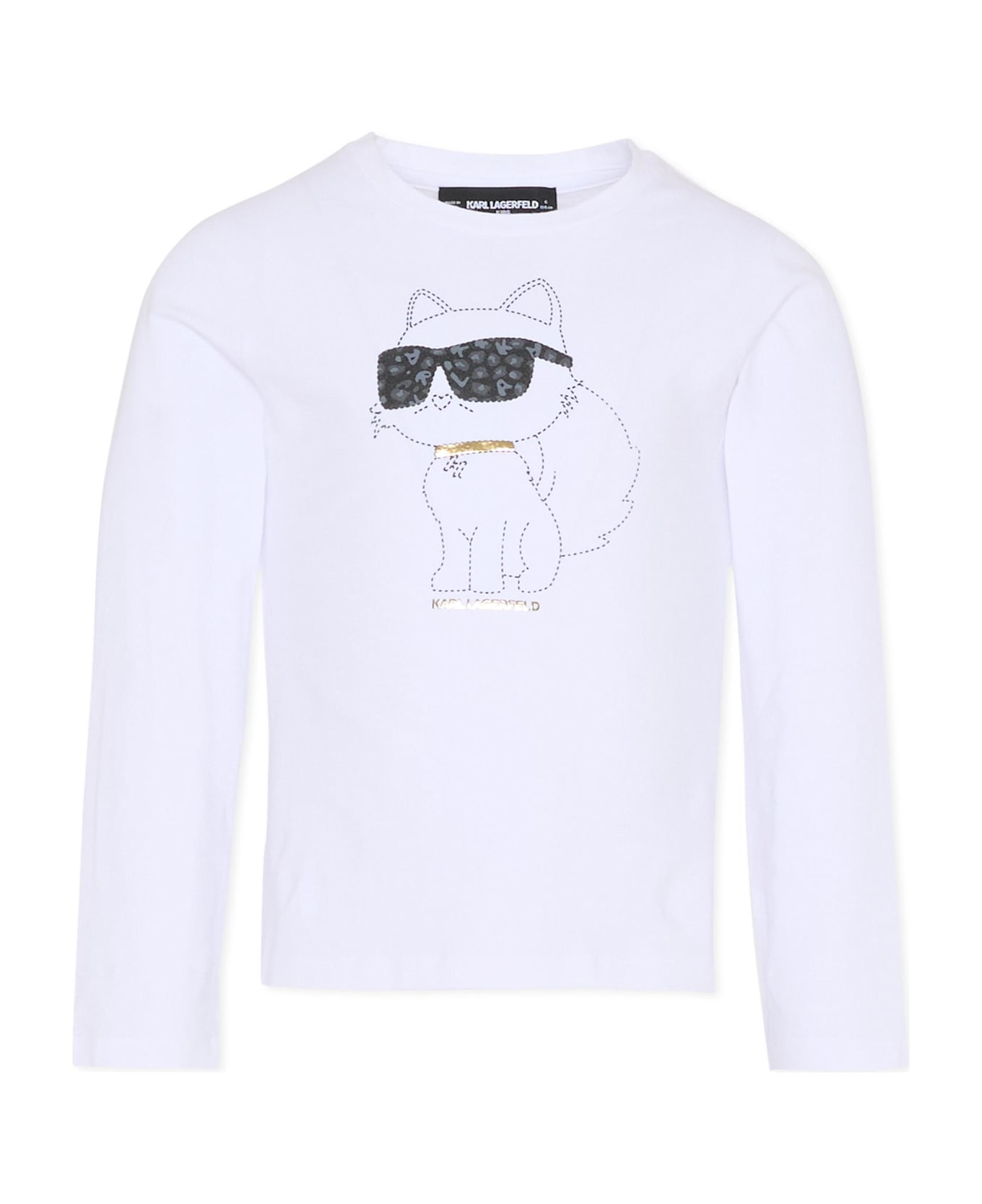 White organic cotton blend t-shirt, with long sleeves and ribbed crew neck. It is embellished with Choupette print, on the front and logo on the back.