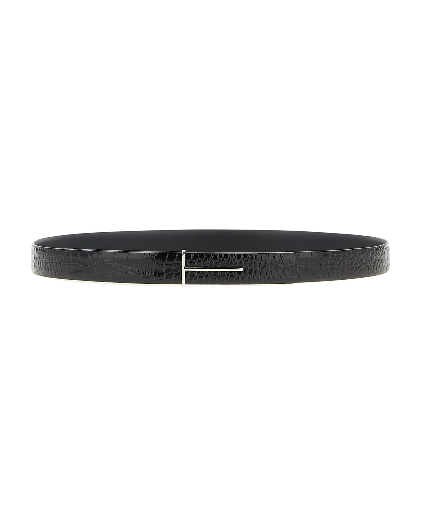Reversible belt in glossy python print and matte smooth leather, metal 'Slim T' buckle. Side A: brown toned glossy python print leather