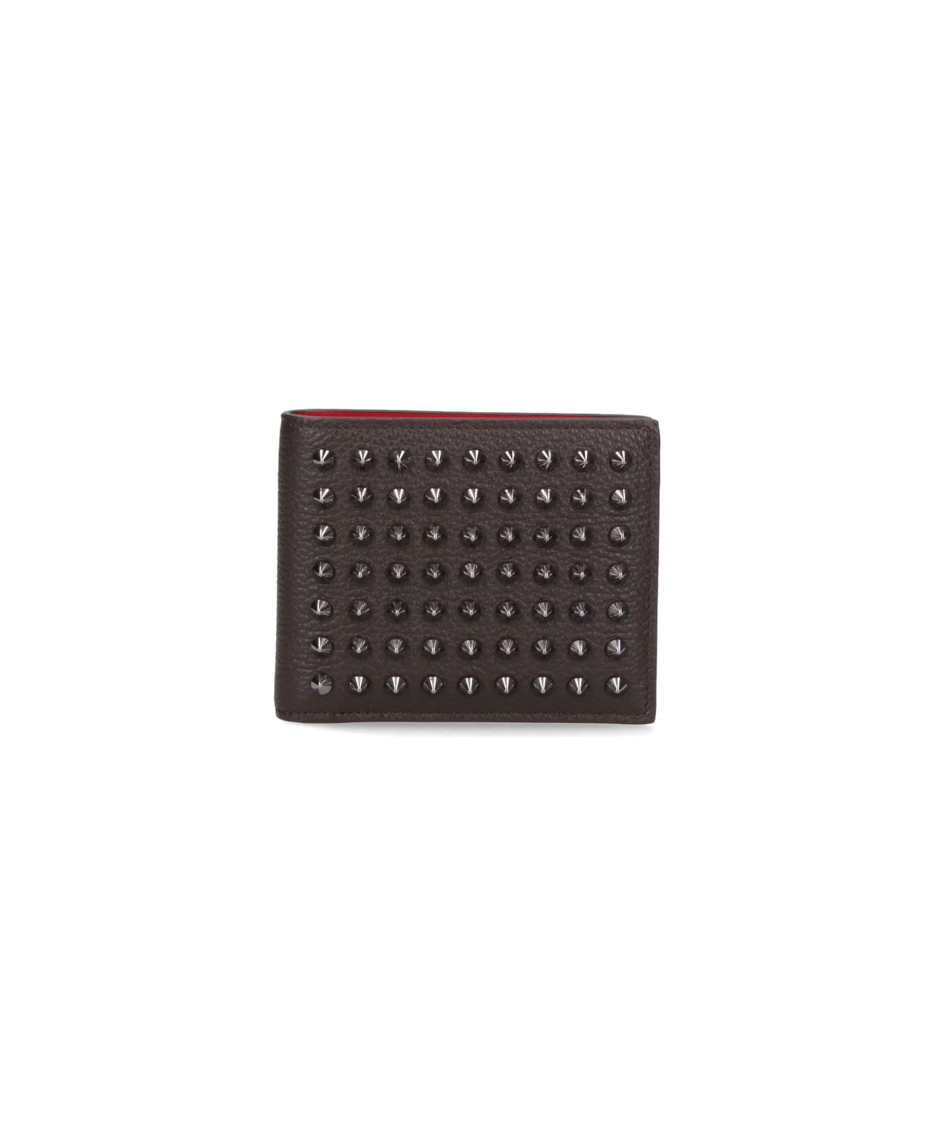 Christian Louboutin 'Funky' bi-fold studs wallet in brown hammered calf leather with eight card slots, one bill compartment, contrasting red interior, 'Spikes' detail on the front.