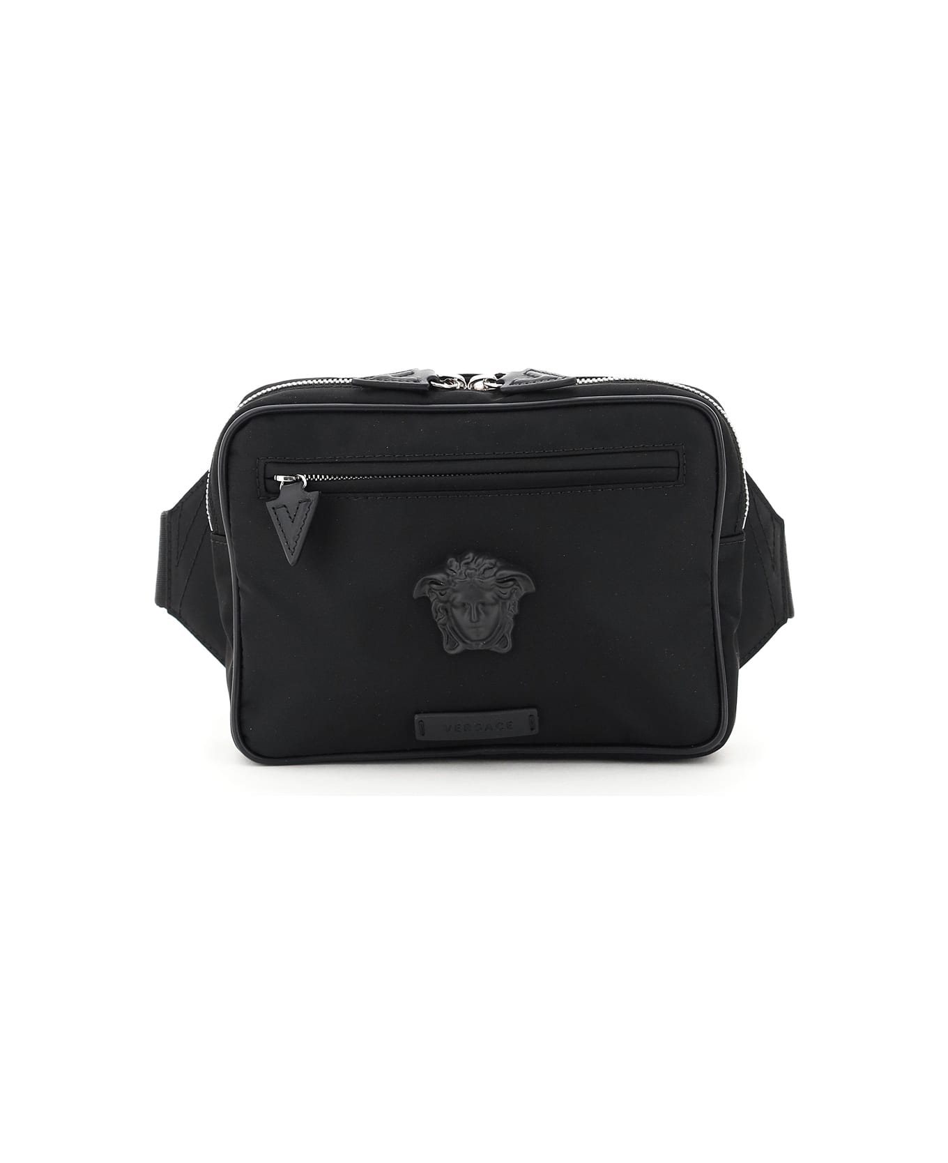 Versace belt bag in nylon fabric featuring the iconic tone-on-tone Medusa in relief on the front. Leather trims, leather logo label, fabric belt with branded snap buckle, silver-tone zip closure, front zip pocket, monogram leather zip puller. Interior lined in contrasting nylon with two pockets, including one with zip.