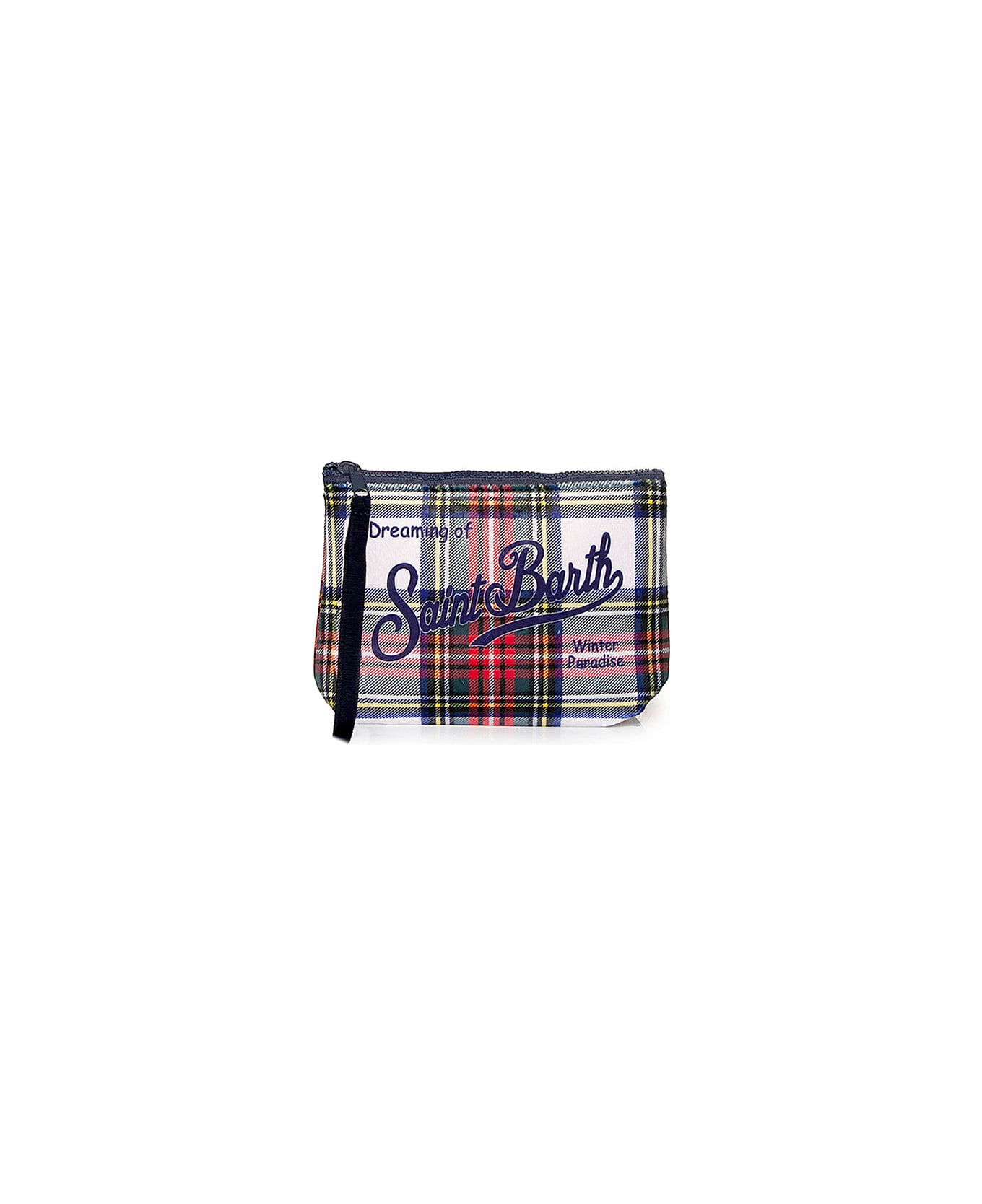 Aline scuba fabric pochette White tartan all over print Wooly effect Saint Barth logo Zip closure Sizes: 20 x 14,5 x 7 cm