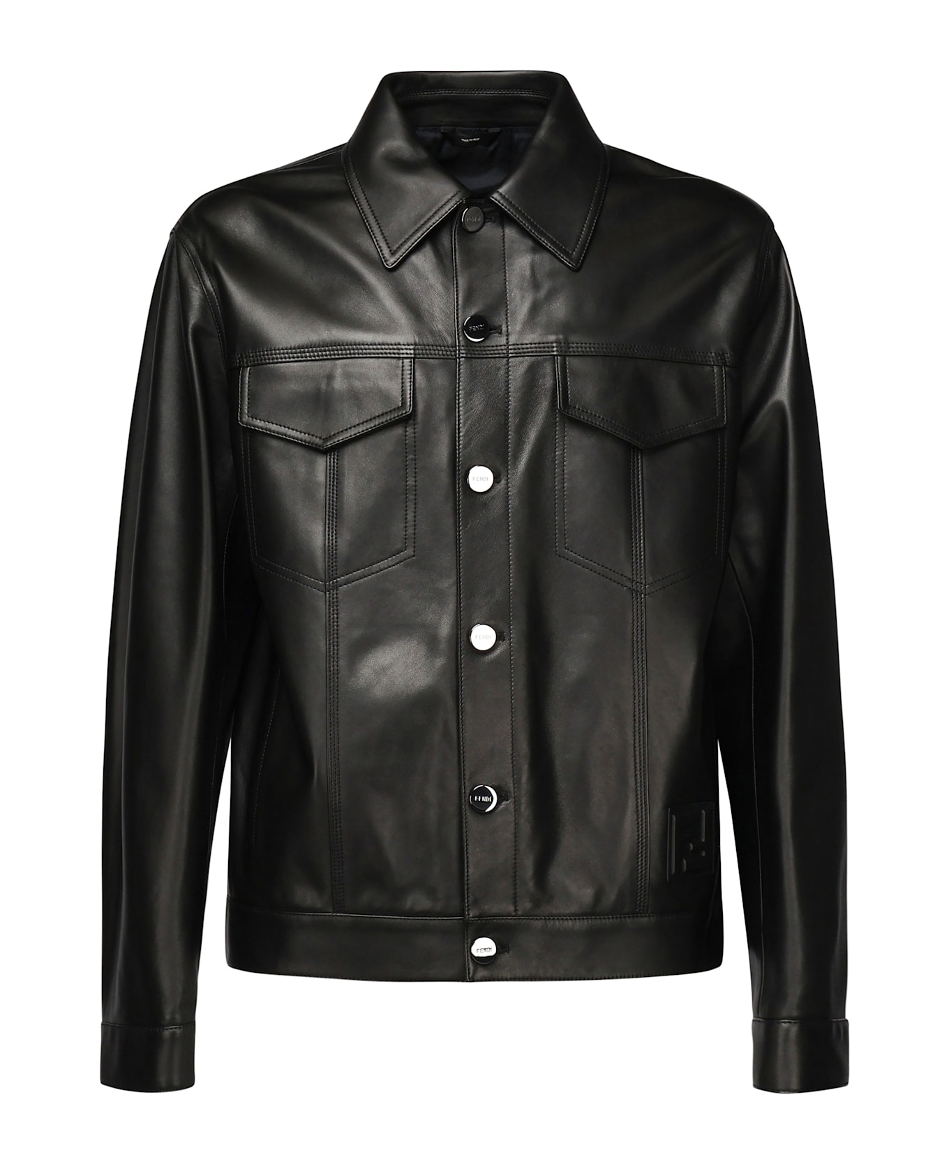 Single-breasted jacket -Shirt collar -Long sleeves -Side pockets and patch flap pockets on chest -Custom metal stud button closure. -Made of soft nappa leather -Refined with tone-on-tone embossed FF patches -Size shown in photo is 50 -Made in Italy -Color: Black Composition: 100% Lambskin