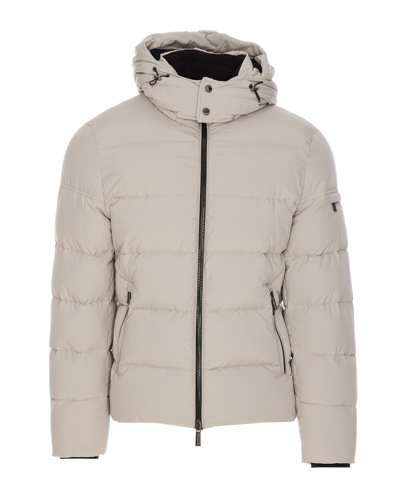 Moorer grey Brett down jacket with frontal zip closure, removable hood detail, lateral zip pockets, padded, lateral zip pockets, cuffs Composition: 100% Polyester, 100% Polyamide, Real Goose Down