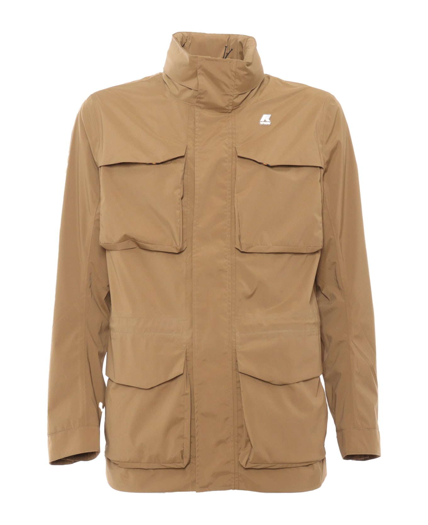 Brown K-way mens sneza hooded jacket with high collar, 4 patch pockets on the front, contrasting white logo.