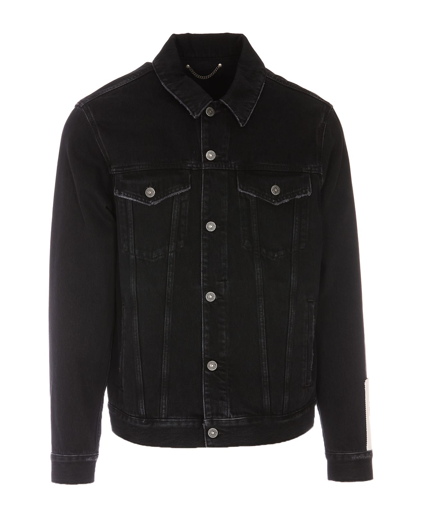 denim jacket, frontal buttons closure, classic collar, patch logo on sleeves, pockets