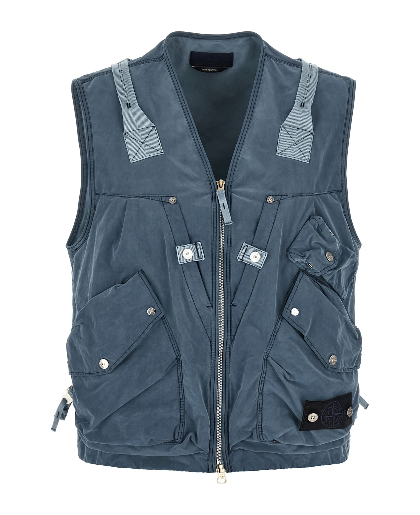 'G100016 David Light Indigo-Tc' lightweight canvas vest made from Japanese polyester and polyamide yarns with star-shaped cross-section dyed and covered with a waterproof agent, utility style with multipockets, V-neck, tonal logo badge and front zip closure, thick nylon webbing handle on the shoulders, adjustable nylon tape straps on the sides.