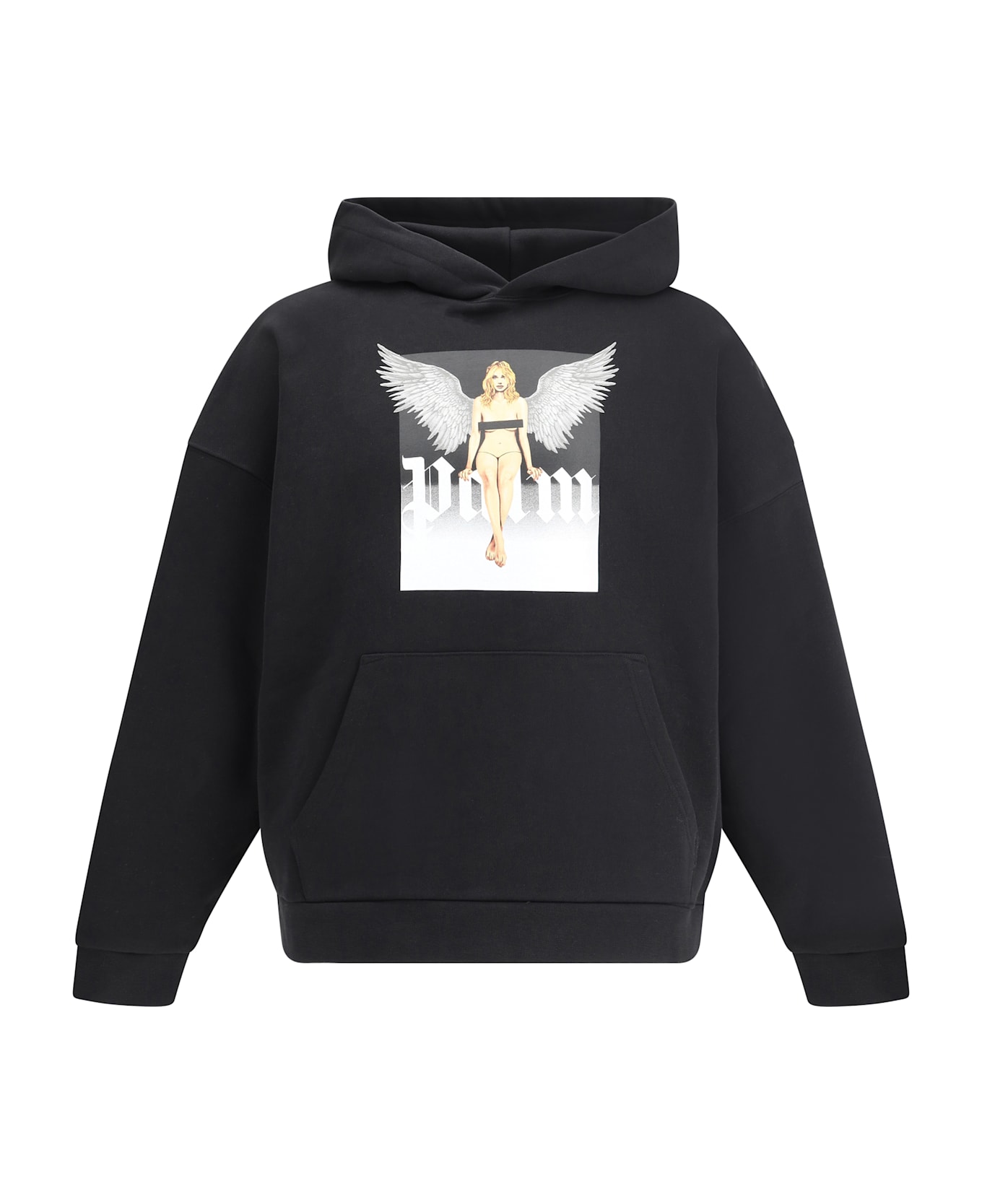Palm angels' crystal pin up cotton hoodie is a statement piece. it is distinguished by elastic cuffs and hem that ensure a perfect fit, while the front kangaroo pocket adds a functional and casual touch. the front maxi print, depicting a pin-up along with the brand's iconic monogram is the real focal point of this sweatshirt, which combines vintage aesthetics and the streetwear mood typical of palm angels.