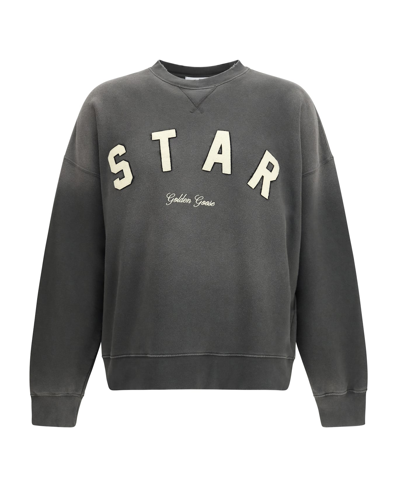 The star embroidered sweatshirt by golden goose combines comfort with iconic style in a contemporary piece. in vintage grey mélange with a unisex oversized fit, it is made from soft cotton fleece with a lived-in treatment for a worn-in effect. the crewneck design is enhanced by the gold star embroidery, the golden goose logo on the front, a triangle detail under the collar, and the double star on the back, creating a unique and distinctive look.
