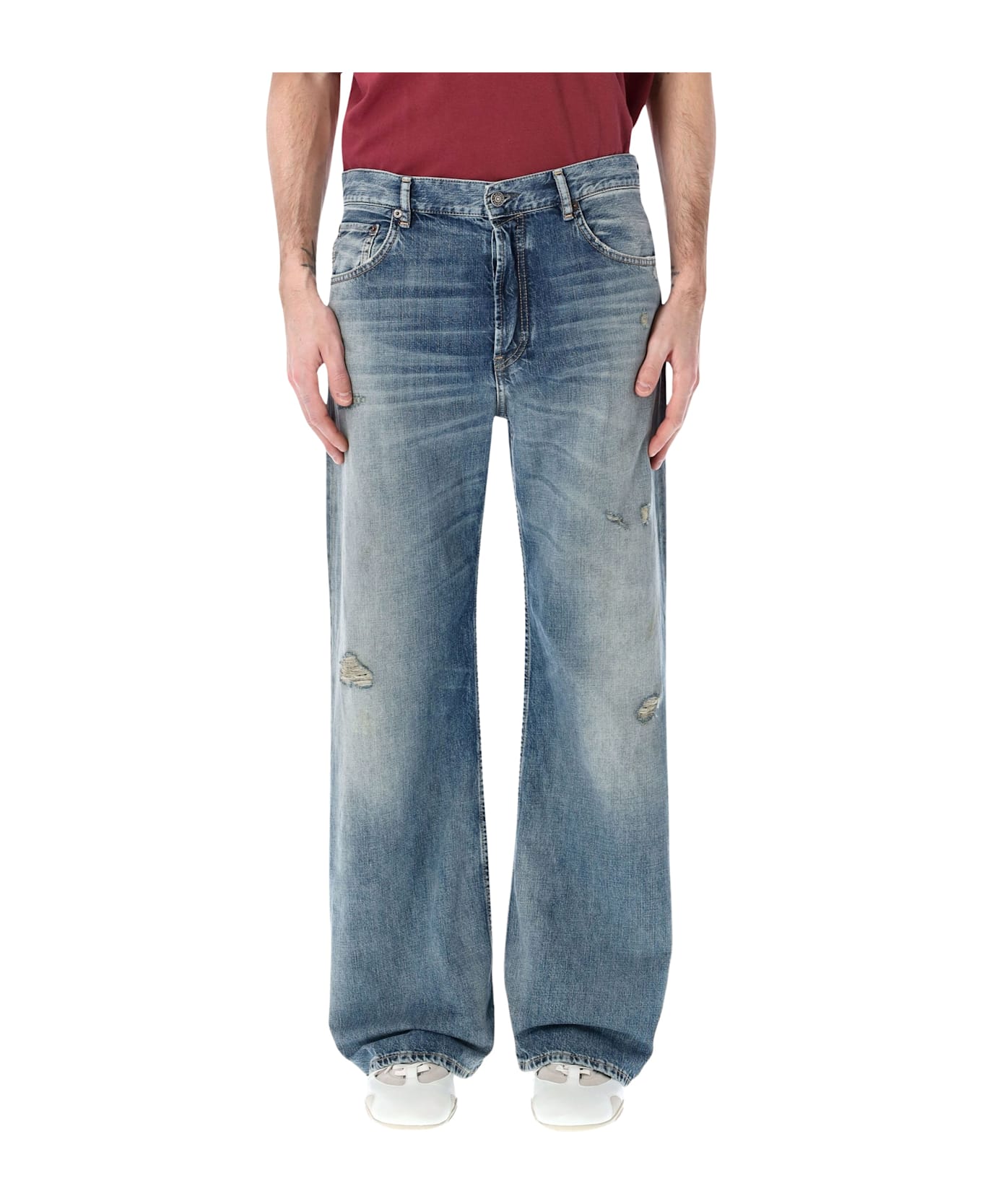 The Acne Studios 2021m Jeans Reinterpret Classic Denim Through A Refined Vintage-inspired Aesthetic. Crafted From Non-stretch Denim With A Visible Weave, They Feature A Pale Wash Enhanced By Hand-applied Distressing For An Authentic Worn-in Look. Designed With A Regular Fit, Mid-rise Waist And Wide Straight Legs Subtly Flared From The Knee, They Offer A Balanced Silhouette That Blends Heritage Character With Contemporary Proportions. Regular Fit Mid-rise Waist Wide Straight Leg With Slight Flare Hand-distressed Finish Five-pocket Construction Button Fly Andrea Is 1,90 M And Wears Size 32
