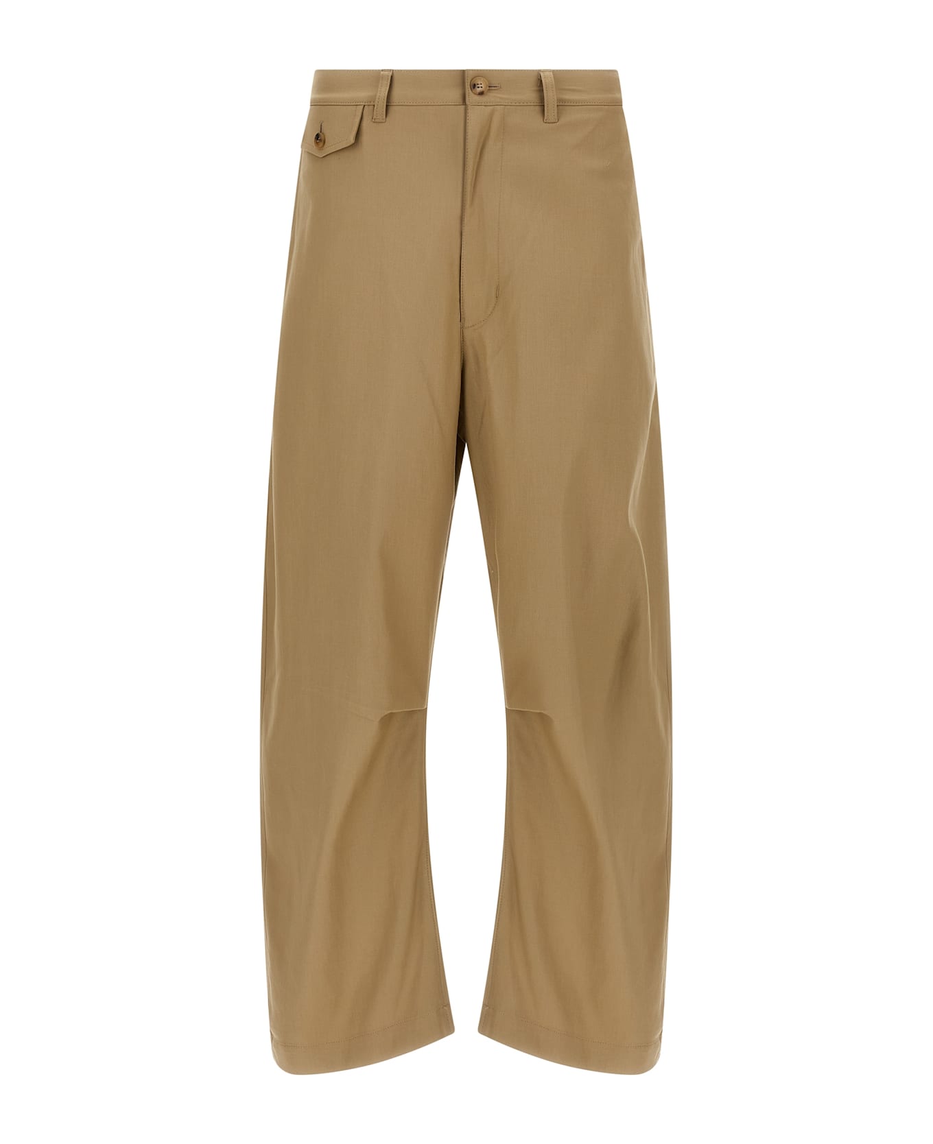 Light cotton trousers, curved leg with knee pincer, low crotch, front zip and button closure, adjustable back strap, pockets.