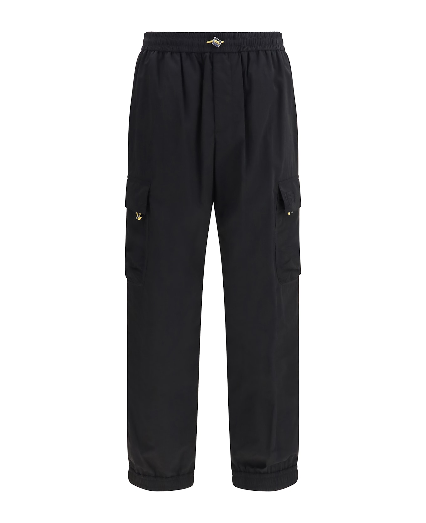 The gabardine pants by fendi feature a contemporary cargo design, highlighted by a maxi patch pocket on the left leg, customized with a tonal embossed ff logo. the style includes side pockets and rear welt pockets, belt loops, and adjustable side waist tabs for a tailored fit. they fasten with a concealed zip and hook closure. crafted from black stretch cotton gabardine, they provide both structure and comfort, with a 24 cm hem width.