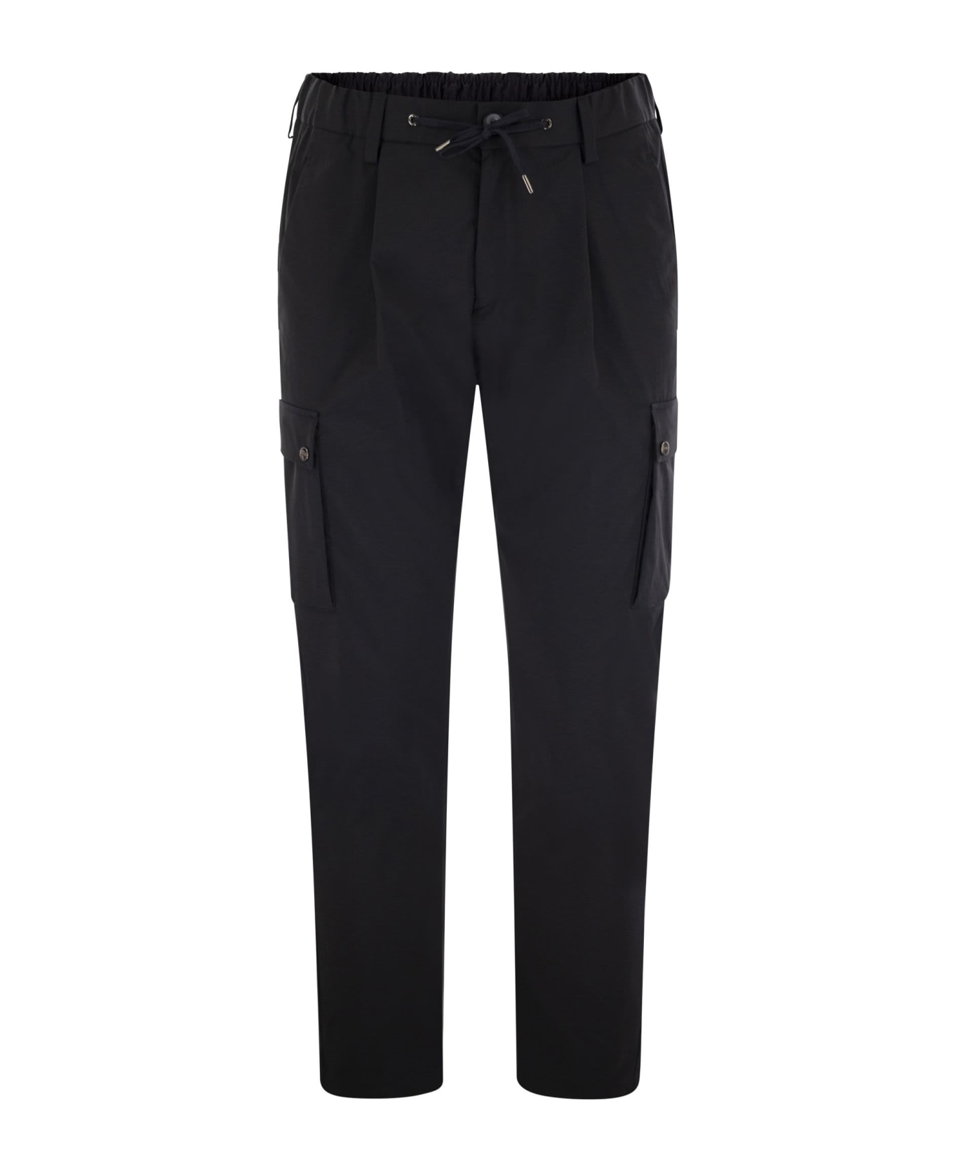 Cargo trousers made of mechanical stretch twill with a characteristic washed finish that gives the texture softness and a vintage wavy effect. Lightness, functionality and sophisticated appeal characterise this model, designed to interpret the relaxed appeal of travel and leisure moments. - Regular fit - Elastic insert with drawstring waistband - Darts - Hip pockets - Cargo pockets with flap and snap buttons - Welt pockets on the back - Button and concealed zip fastening - Metal logo on the back DESIGNER ID: PT00020UR12531 9200 Composition: 100% Polyester Details lining: 100% Cotton