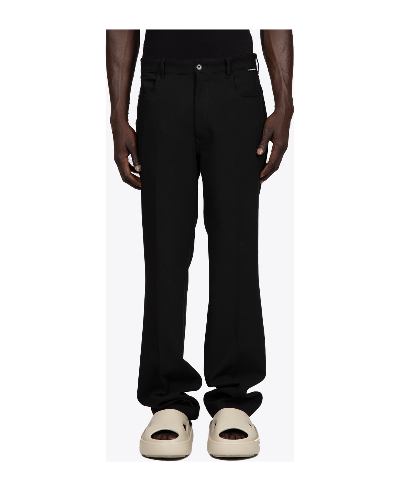 Black tailored trousers with zip and button closure. Two side pockets. Two back pockets. Flared leg fit. The model is 185 cm and wears size M. Composition: 73% polyester 20% viscose 7% elastane. Made in Turkey.
