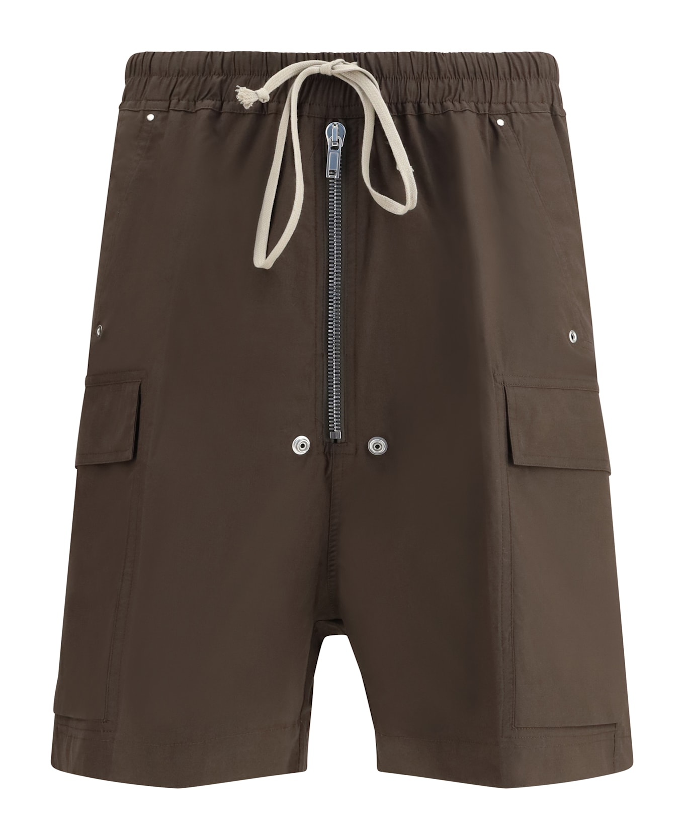 The cargo shorts by rick owens combine functionality and contemporary style in a distinctive urban design. made from black stretch cotton, they feature an adjustable drawstring waist and front zip closure for a customized fit. the model has two slanted pockets and two flap pockets on the front, while the straight leg completes the design with a clean, modern line, perfect for casual and trendy looks.
