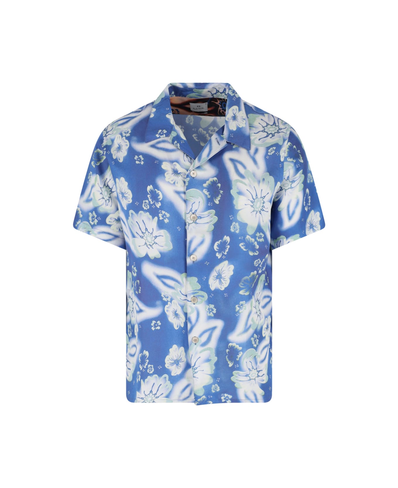 - Paul Smith printed shirt in blue lyocell - all-over floral pattern - bowling collar - button closure - short sleeves