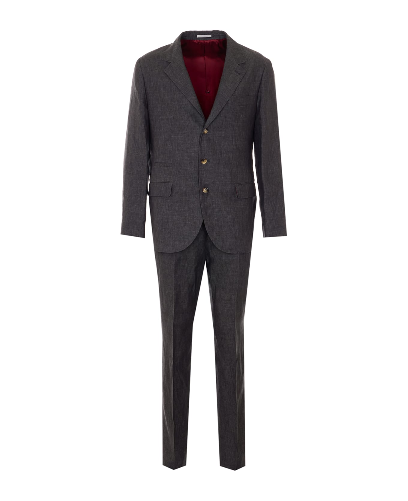 Brunello Cucinelli grey suit, jacket with single breasted buttons closure, V-neck, long sleeves, pants with zip and buttons closure, lateral pocets, loose fit Composition: 100% Linen