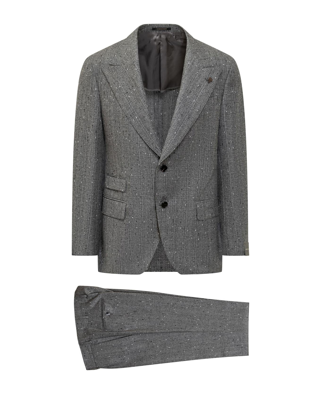 Grey wool dress. Lapel collar. Flap pockets. Button fastening. Long trousers. Belt loops. Back pockets. Side pockets. Side pockets. Closure with hooks and zip.