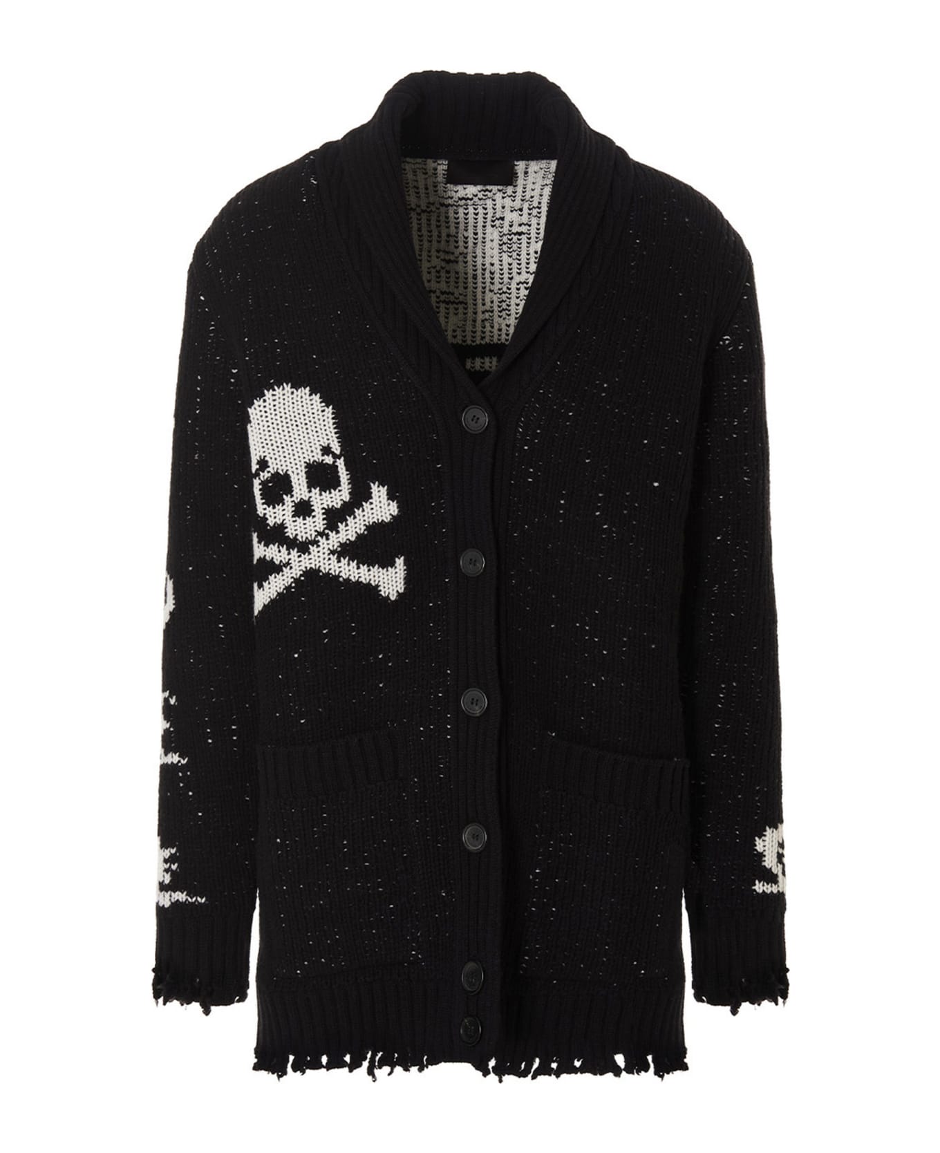 'Skull' long wool cardigan with an all over jacquard design, a button closure, long sleeves, frayed details, a used effect, and pockets.