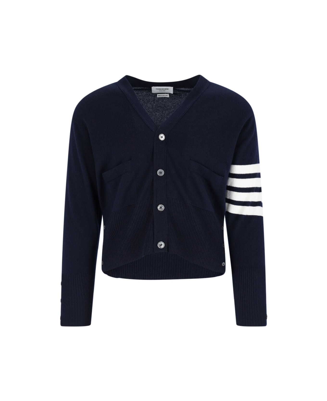 Thom Browne '4-Bar' Crop Cardigan, cashmere, blue color, v-neck, button closure, two front pockets, side buttons, iconic '4-bar' sleeve detail, adjustable button cuffs, tricolor cuff detail, tricolor back tab, ribbed trim, straight hem.