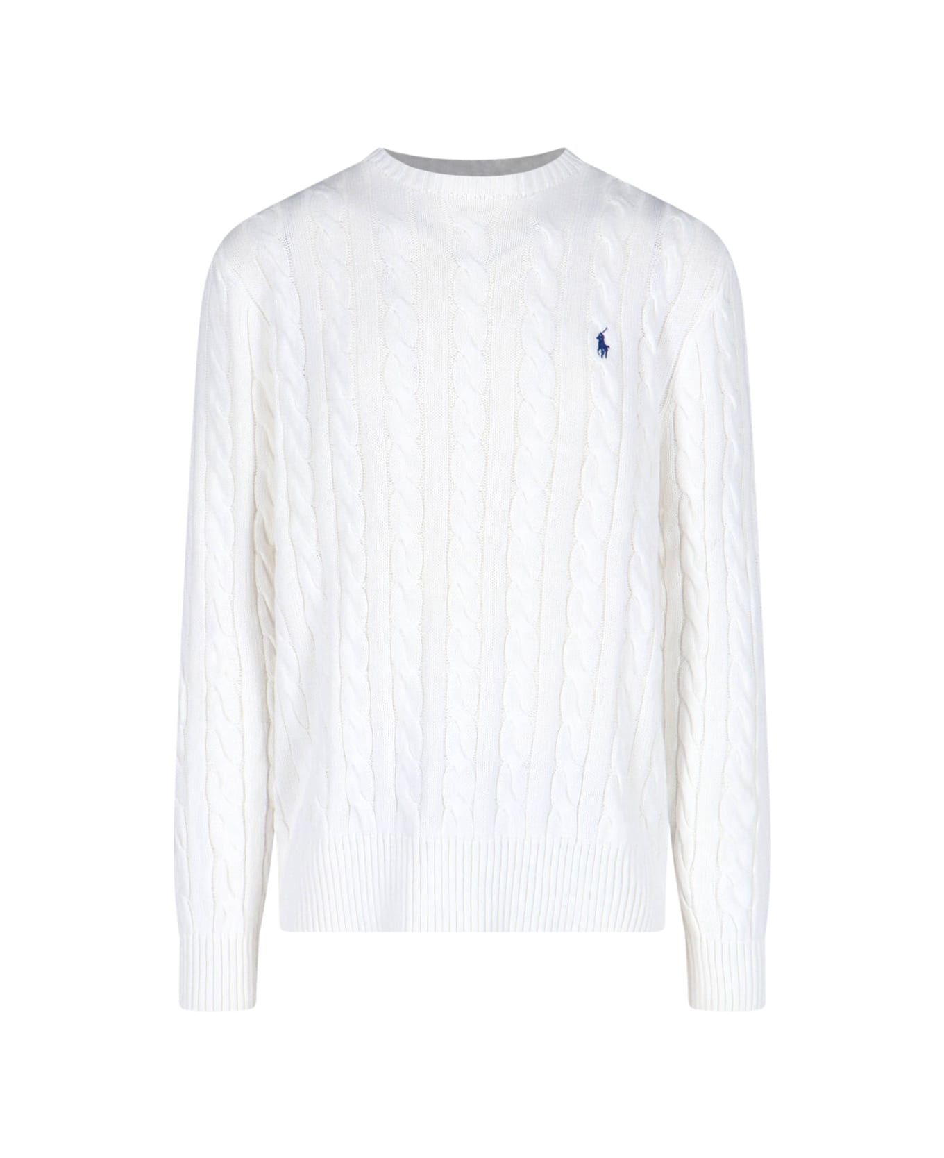 Polo Ralph Lauren logo cable sweater in white cotton with crew neck, blue logo embroidery on the chest, ribbed trims, straight hem.