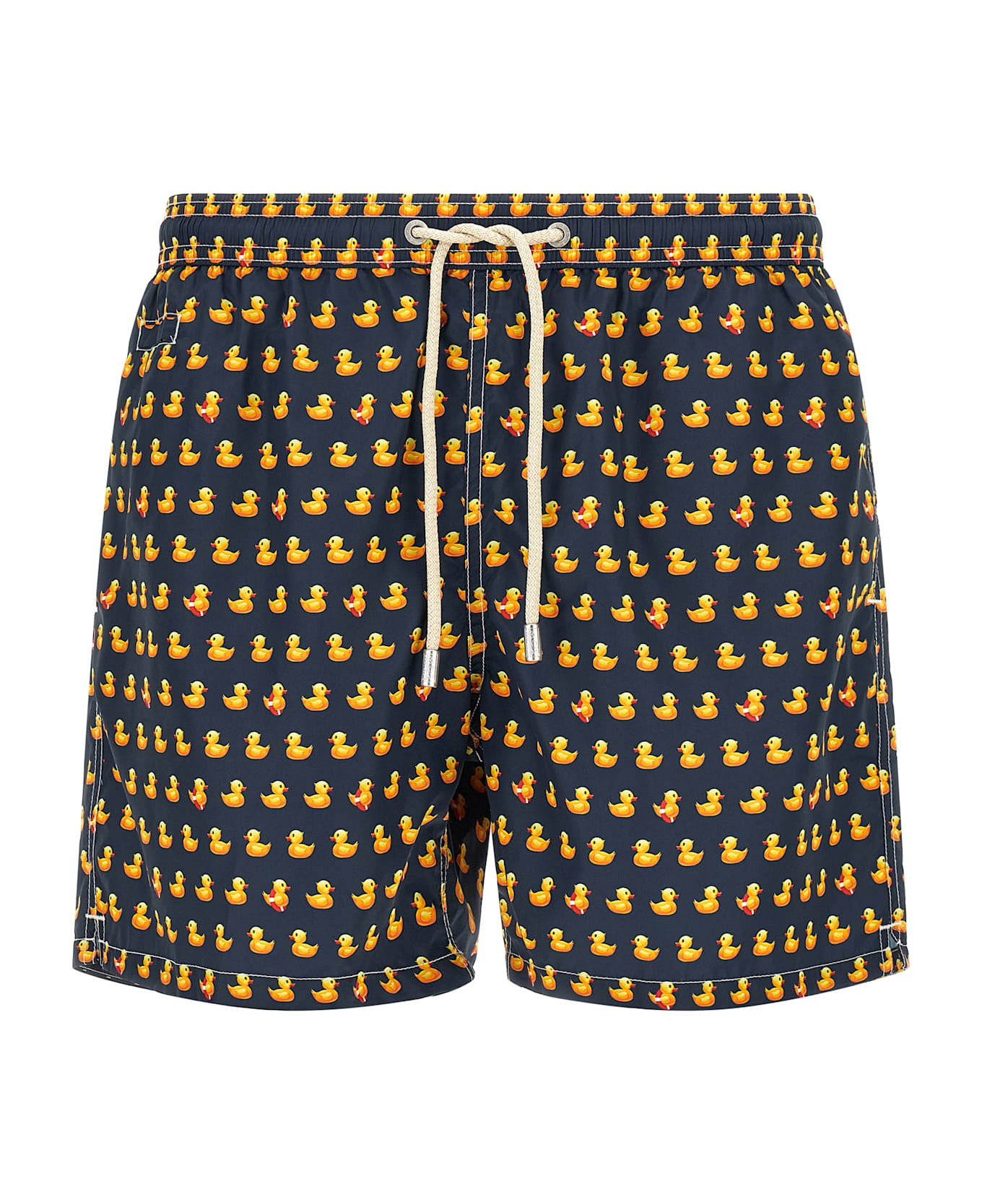 'Lighting' swimsuit in quick-drying lightweight technical fabric with rubber duck print, medium length, back logo patch, drawstring elastic waistband, pockets, side slits at the hem, inner mesh briefs. SUSTAINABLE: Product made from recycled polyester.