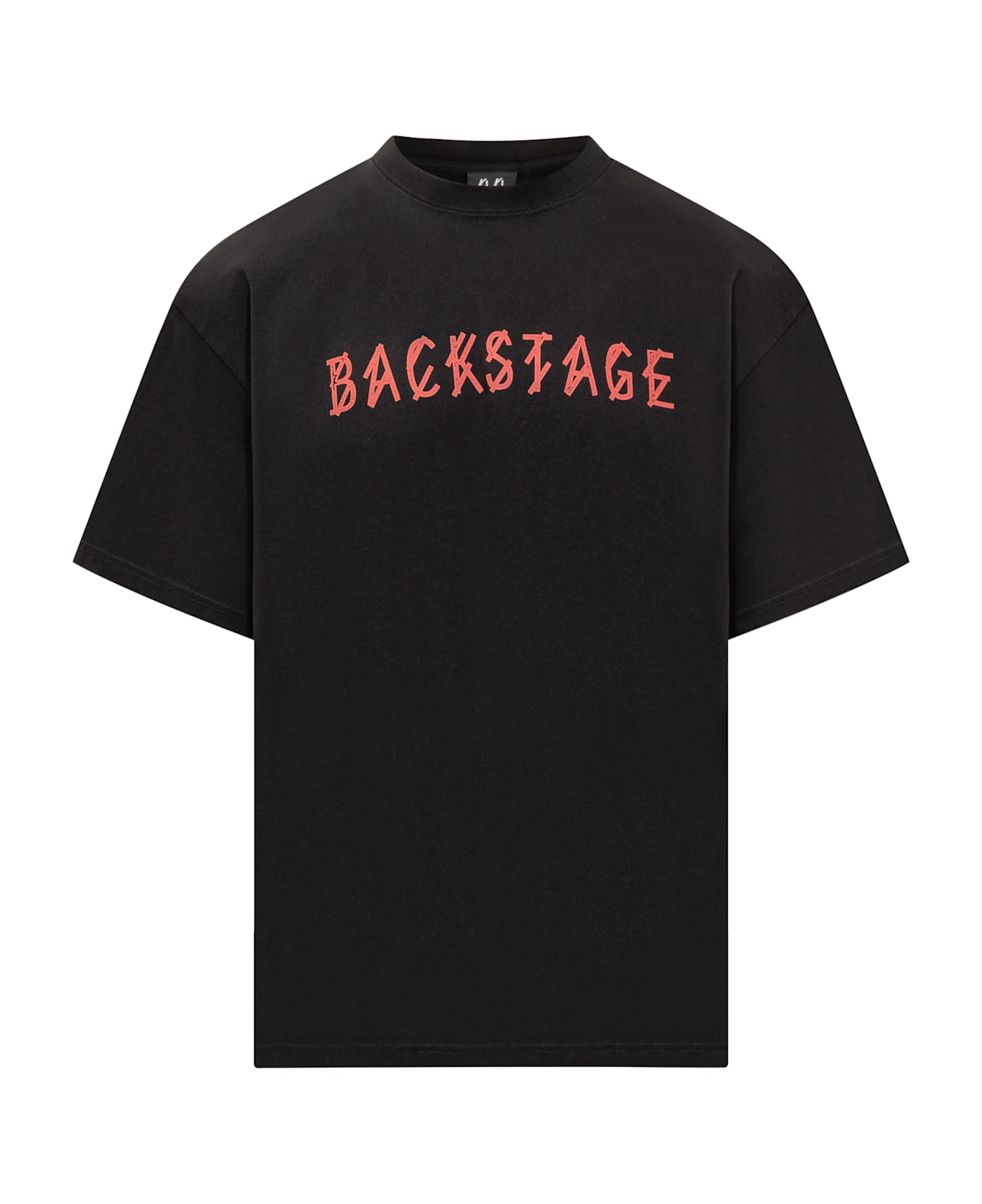Black cotton T-shirt. Round neck. Front Backstage print. Back printed logo.