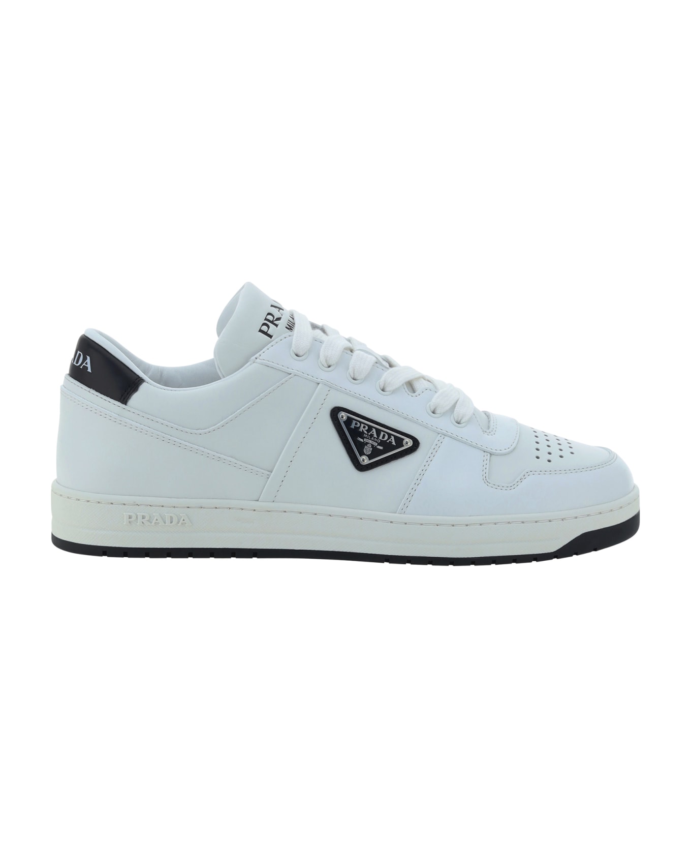 Prada's downtown leather sneakers are a mix of elegance and sportiness. the leather panel design creates a modern and dynamic look, while the front lace-up closure ensures a secure fit. the round and perforated toe adds stylish details and ventilation. the iconic enameled triangular plaque with the brand's signature on the external side panel, together with the logoed heel and front label, highlight prada's distinctive character. with a flat sole, these sneakers are perfect for a casual and trendy look, without sacrificing comfort.