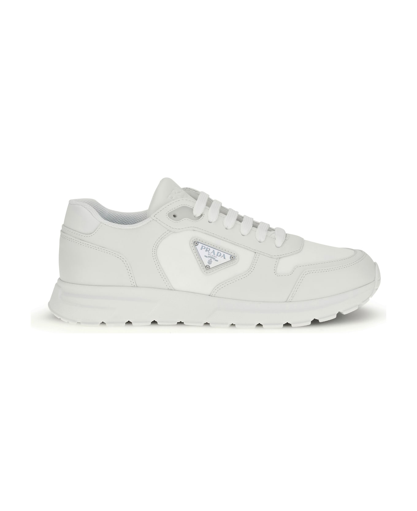 The sneakers by prada, made of re-nylon and brushed leather, combine contemporary style and innovative materials. equipped with laces, they feature an enameled triangle logo on the upper and screen-printed prada milano lettering on the tongue. the lightweight rubber sole with serrated welt ensures comfort and grip, while the removable leather-covered footbed completes the design with a functional touch.