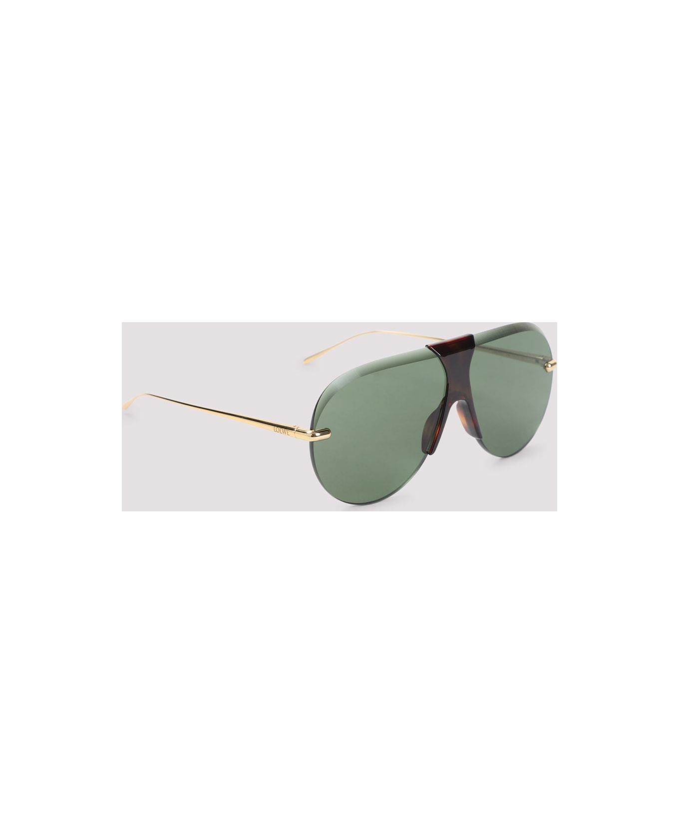 Loewe Eyewear Safari Brown Acetate Sunglasses. Aviator-shaped sunglasses, featuring a frameless construction, green lenses, a Havana brown acetate bridge and nose pads, and gold-tone fine metal temples.