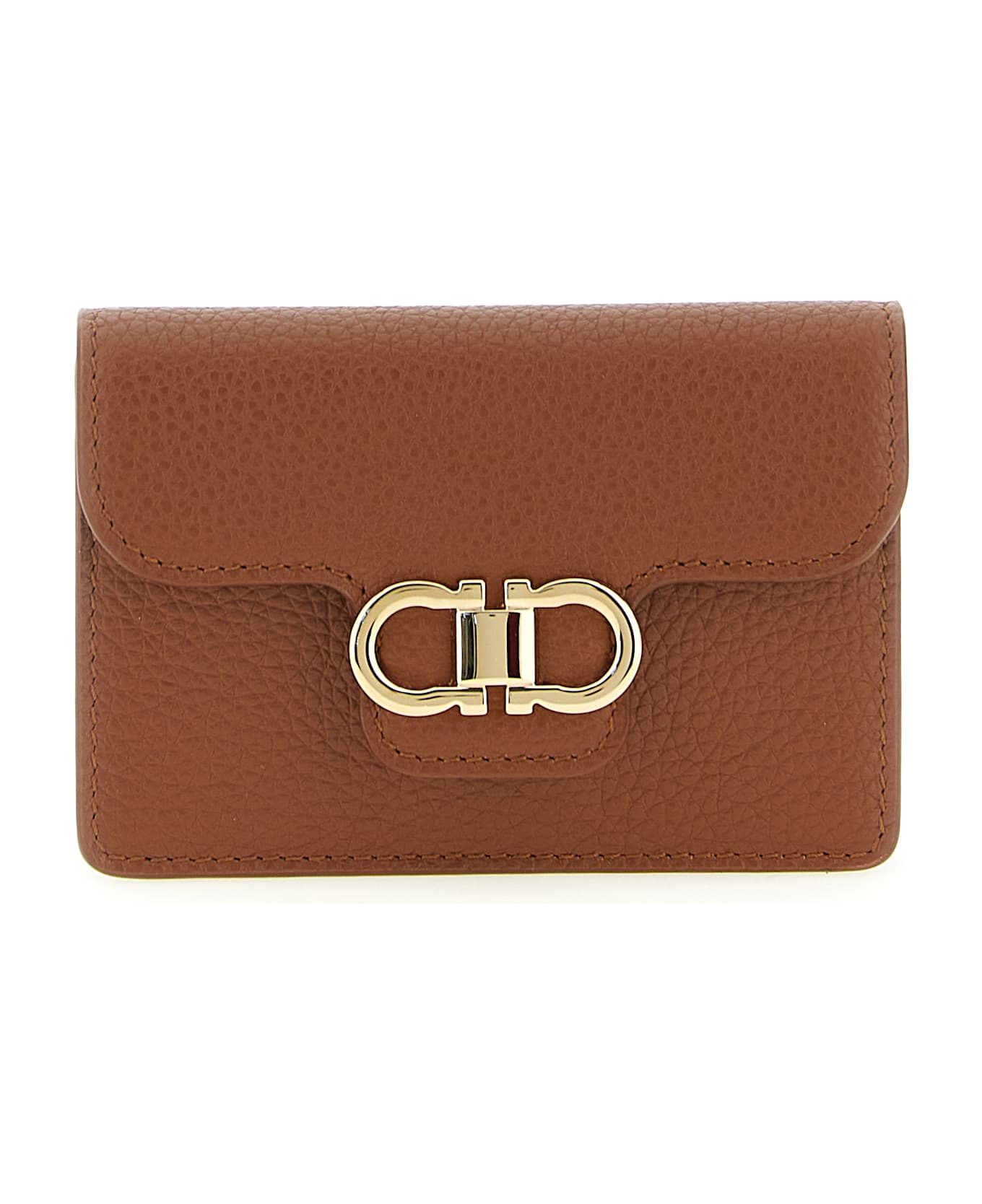 Hammered calf leather keyring, flap closure with snap button and front metal 'Gancini' logo detail, contrasting smooth leather lining, metal ring chain, back pocket. Composition: 100% calfskin leather (Bos Taurus)