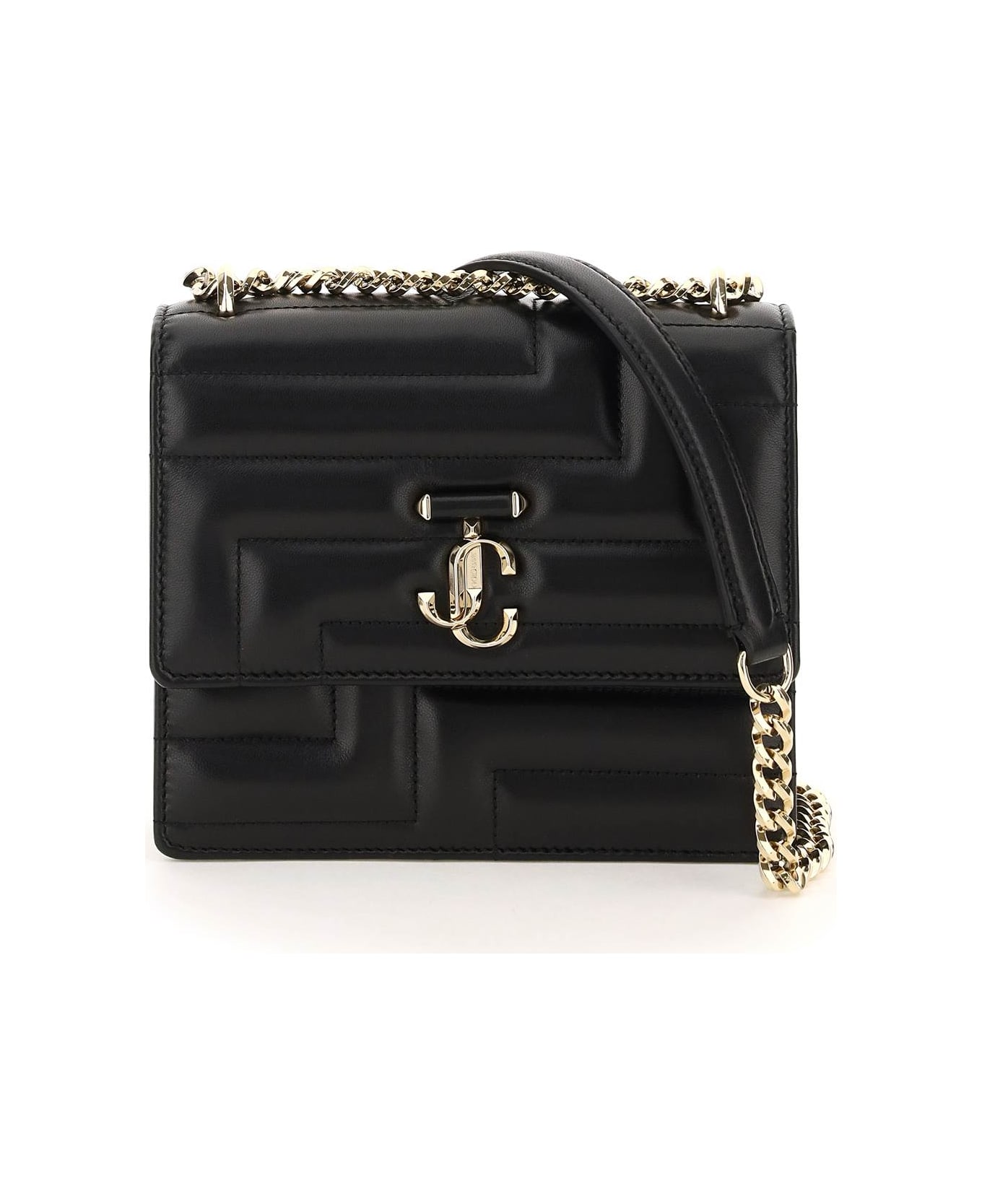 Soft matelasse nappa leather bag by Jimmy Choo with metallic JC logo applique on flap. Press button closure, suede interior with a credit card slot. Sliding chain shoulder strap with a leather insert. Gold-finish metalware.