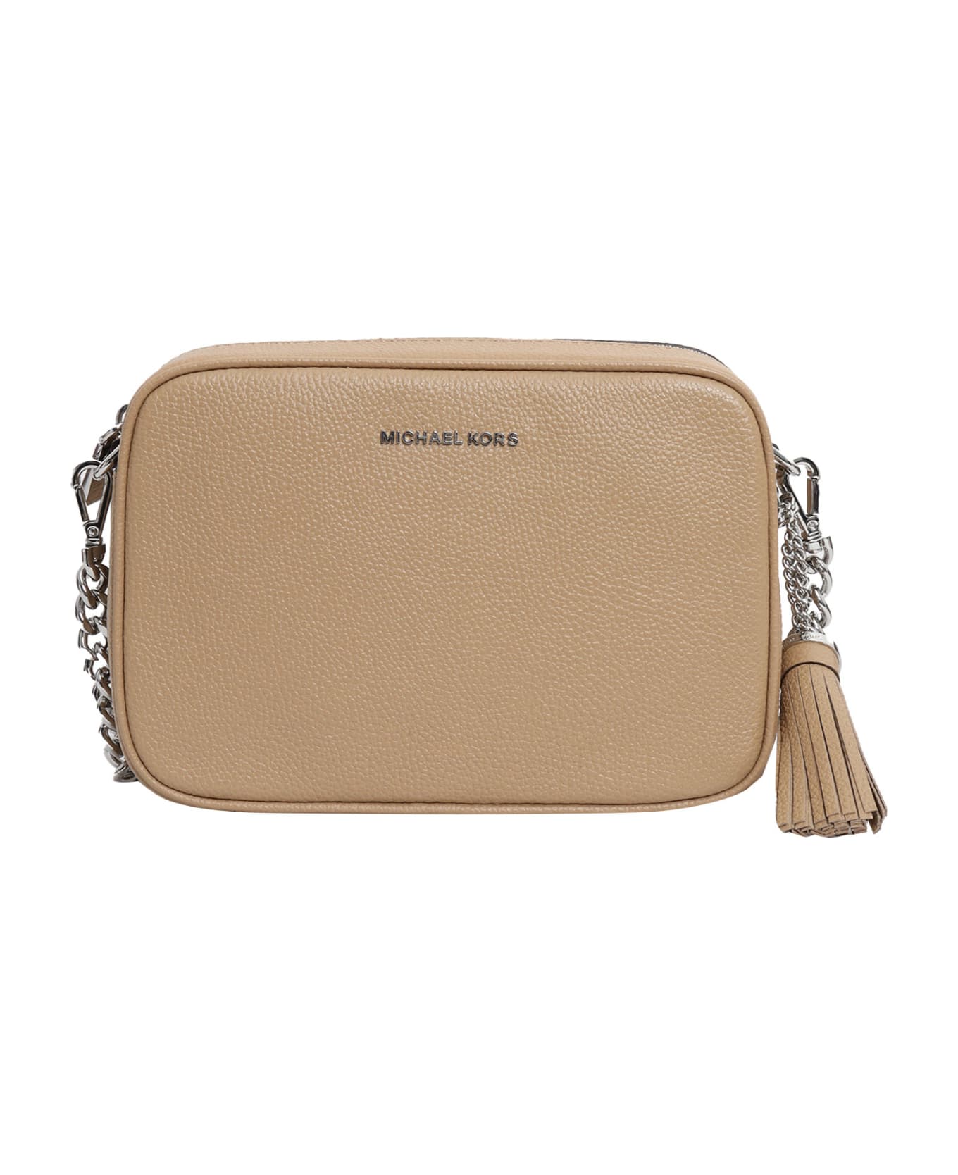 Textured leather bag, chain, oversized tassel, silver-tone metal details, inside back zip pocket, inside front welt pocket, zip closure
