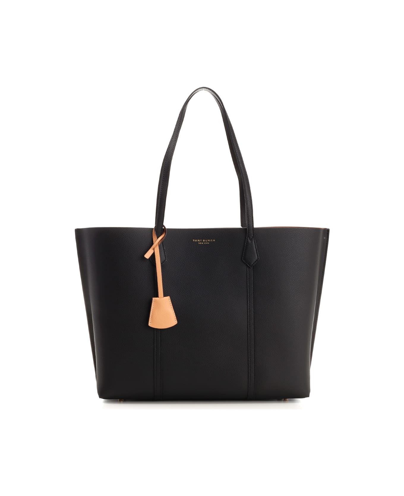 'Perry' medium tote in black leather from Tory Burch with leather interior and 2 separate spaces.