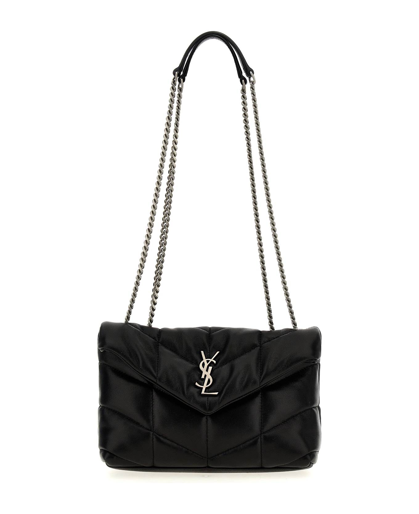 'Puffer Toy' shoulder bag in quilted nappa leather with chevron pattern, magnetic flap closure with front metal logo appliqué, sliding chain shoulder strap. Composition: 100% calfskin leather