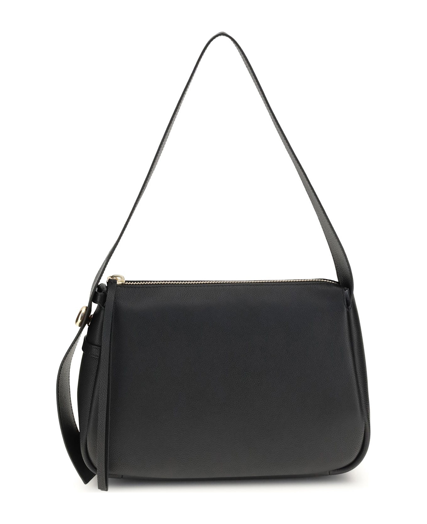 The romy shoulder bag by tory burch is crafted from black pebbled leather, combining elegance and practicality. it features an adjustable handle with gold-tone metal details and logo, a zip closure with leather pull, and a main compartment with an open flat pocket to organize your essentials.