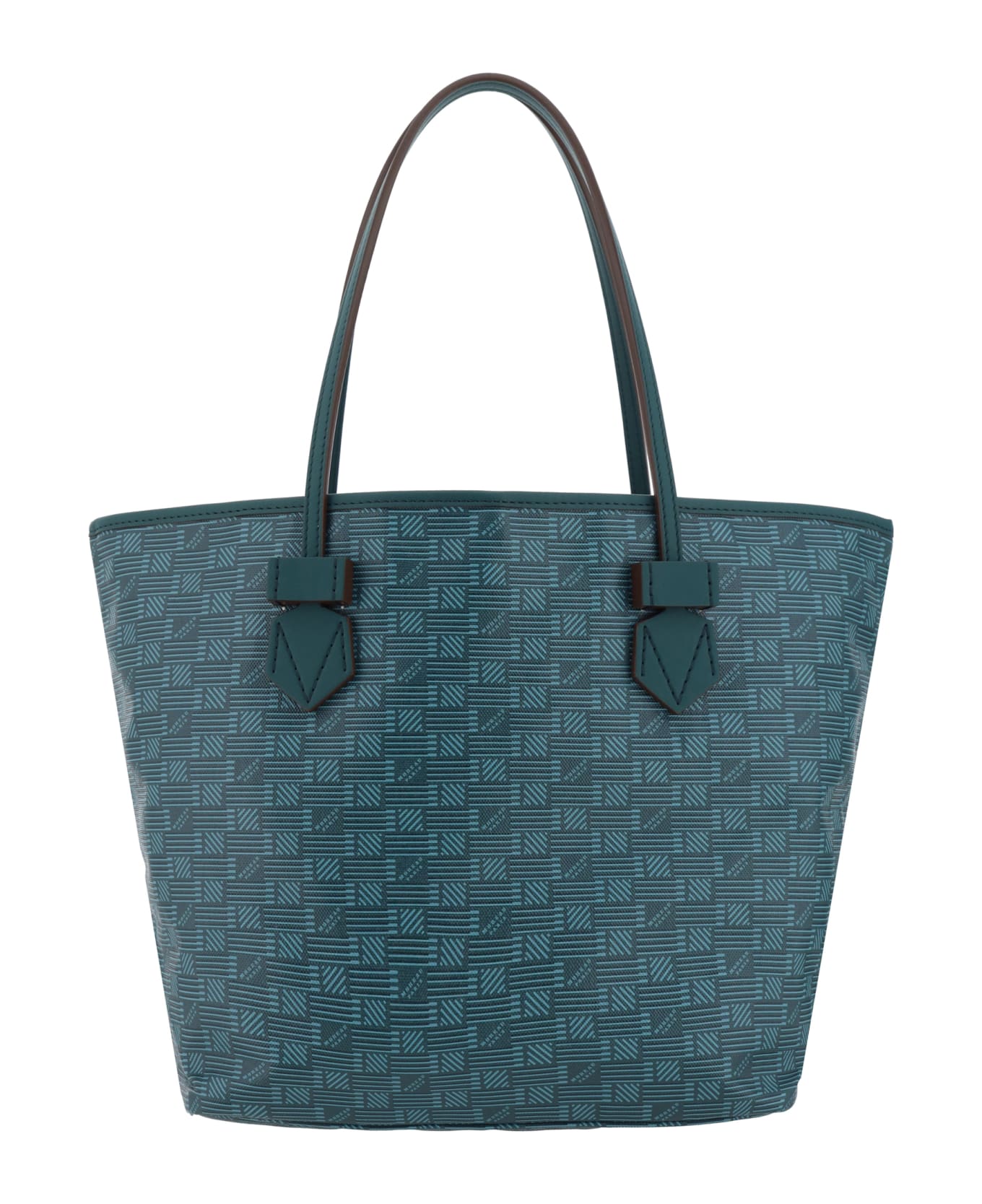 Saint tropez tote medium cotton shoulder bag by moreau, two flat faux leather handles, single interior compartment, interior zippered welt pocket, hook-and-eye closure at top, iconic brand monogram repeated all-over.