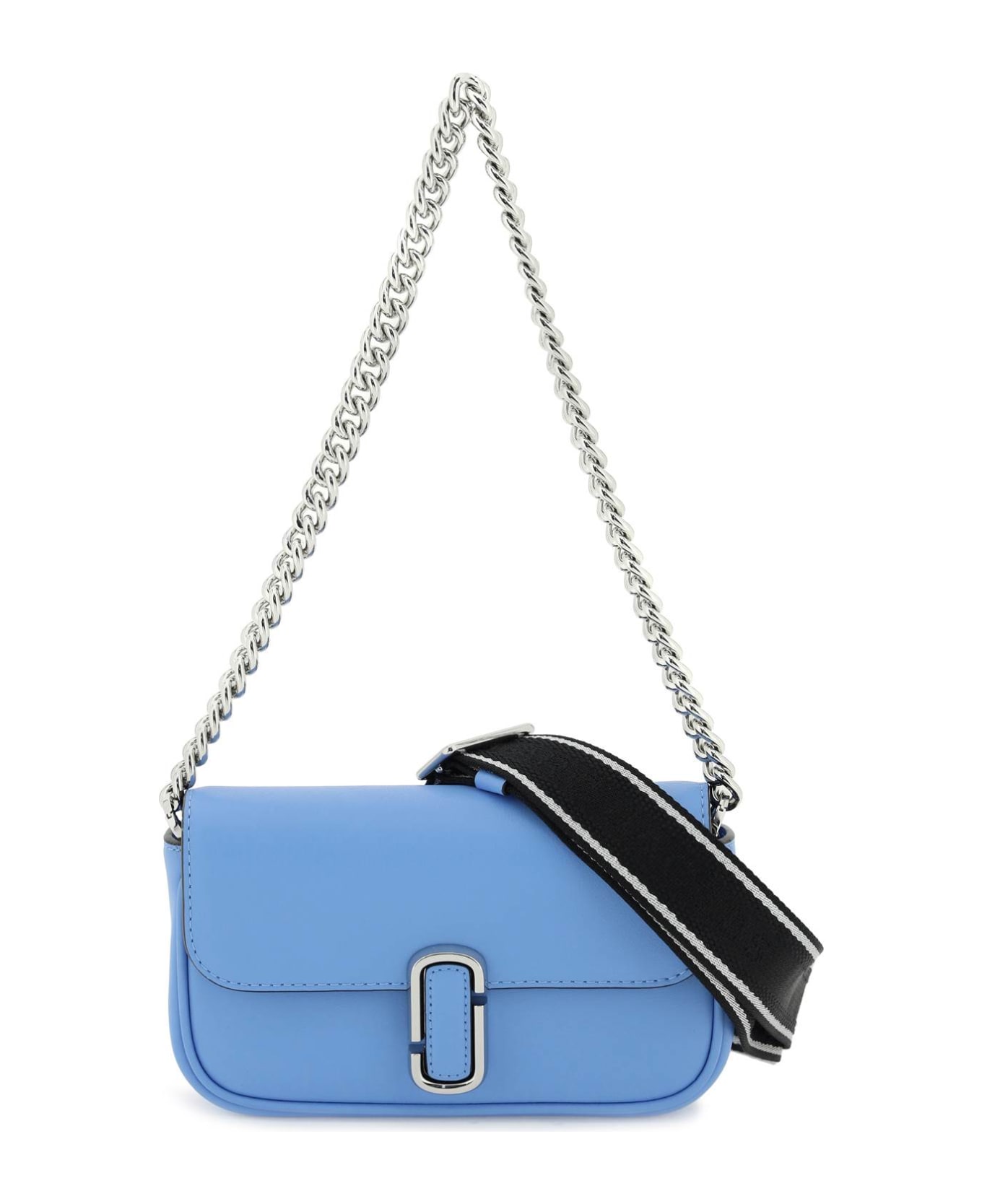 Marc Jacobs smooth leather bag characterized by the flap with magnetic closure enriched with the iconic metal Double J monogram. Chain handle to carry on the shoulder or by hand and detachable and adjustable fabric shoulder strap with jacquard logo and leather details. Rear slit pocket with gold-tone logo print. Fabric lining with three leather credit card slots and a zippered pocket under the flap. Silver-finished metalware.