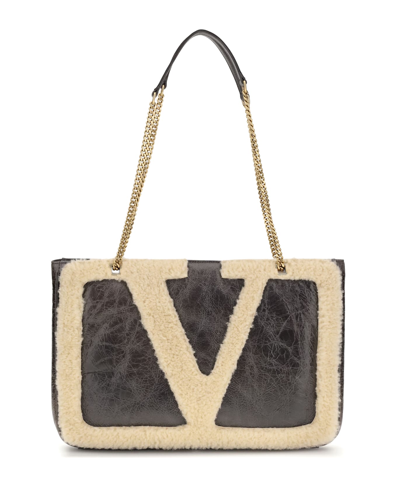 The viva superstar medium tote bag by valentino garavani is a bold, wrap-around accessory perfect for the cold season. made of soft sheepskin, it is distinguished by the contrasting signature maxi vlogo, an iconic element that lends character to the design. the sliding chain allows it to be worn either on the shoulder or crossbody, while metallic parts in an antiqued gold finish and a zipper closure complete the model with a touch of functional elegance.