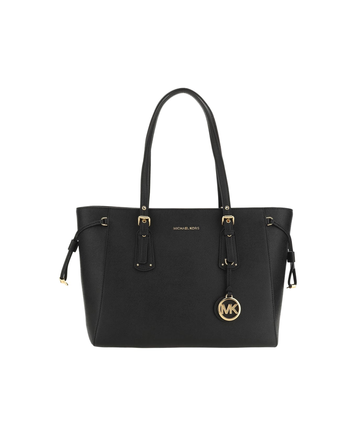 Calfskin voyager tote bag by michael kors, top zipper closure, top double flat handle, plaque with iconic brand monogram embossed applique on front, removable pendant, double interior compartment with internal divider with zippered welt pocket.