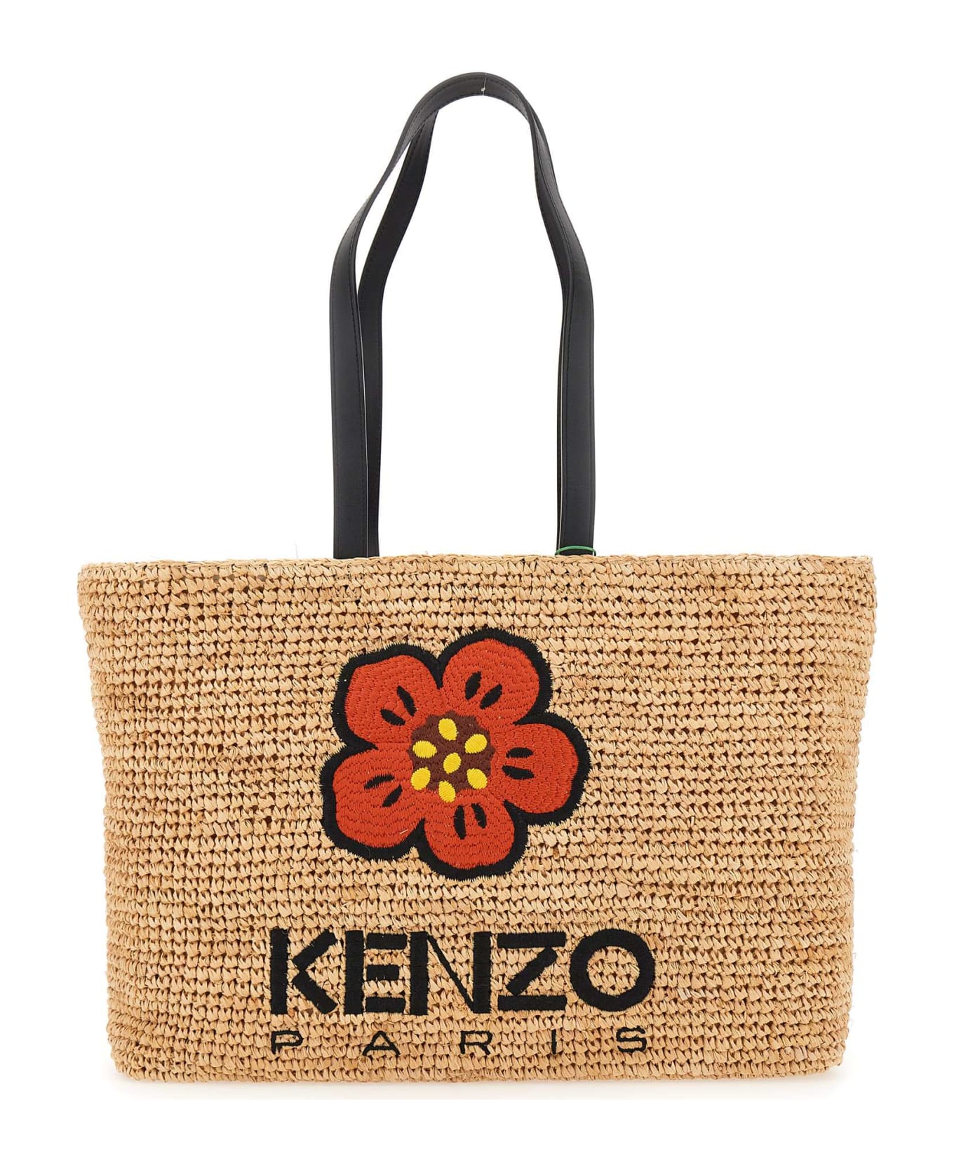 Kenzo Paris "Large Tote Bag" with raffia, shopper model, sand beige with contrasting black profiles, double top handle, magnetic button fastening, inside pocket with zip, front multicolor Boke Flower embroidery. Dimensions: height 30cm, length 42cm, depth 12cm, handle drop 32cm. Fabric case included.