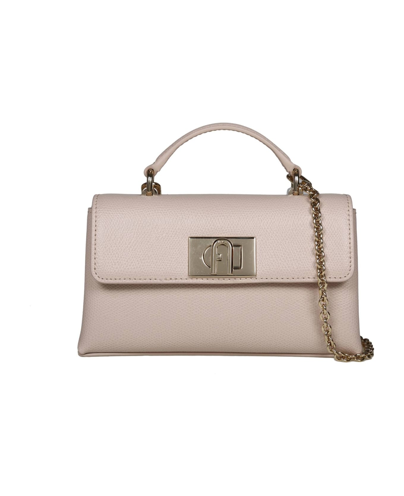 Furla 1927 nude pink colour twist lock with gold finish rigid handle removable chain brings dimensions: 17. 5 x 10. 5 x 5cm internal composition: 80% polyester, 20% leather external composition: 100% leather made in china