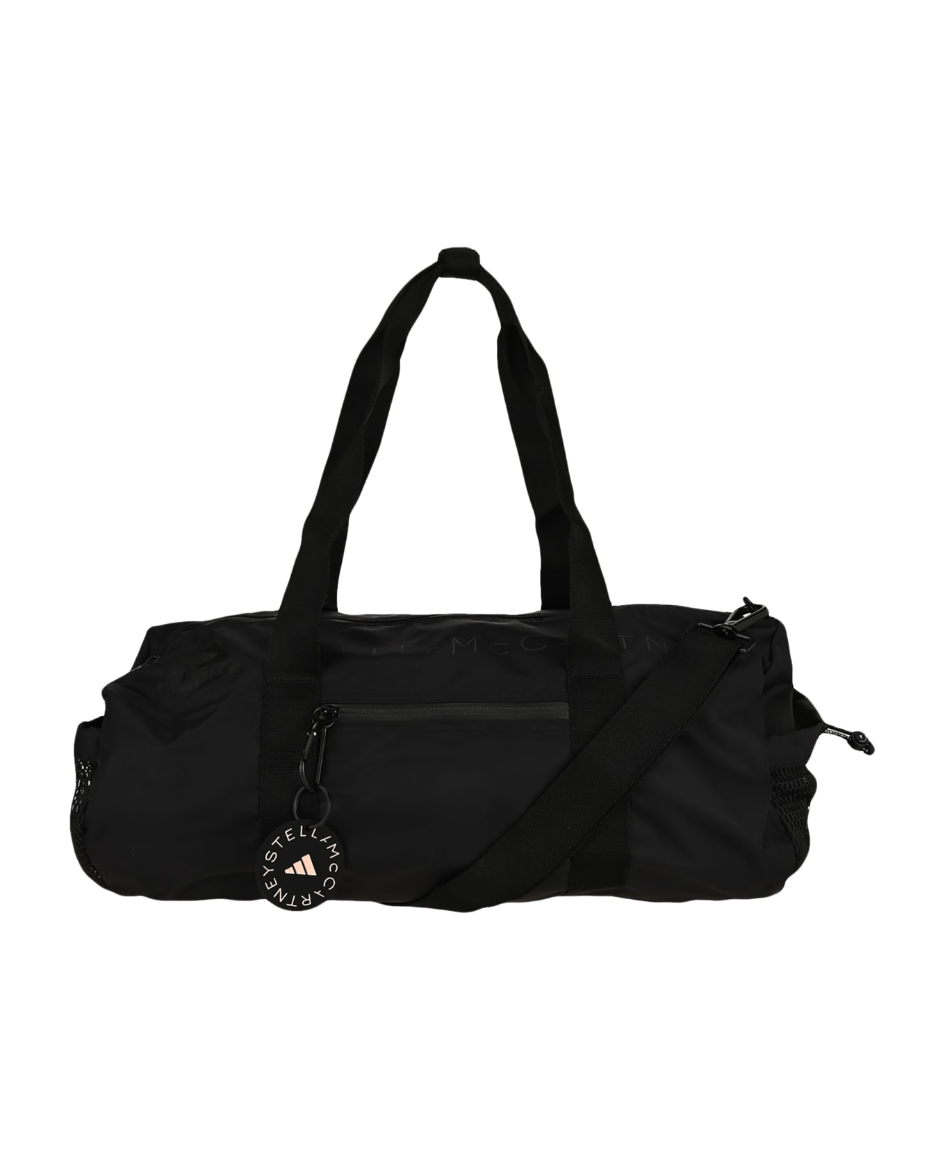 Black Round Duffle Bag By Adidas By Stella Mccartney. Featuring: - Top Handle; - Adjustable And Removable Shoulder Strap; - Top Zip Fastening; - Side Mesh Pockets; - Logo Print To The Front; - Front Zip Pocket.