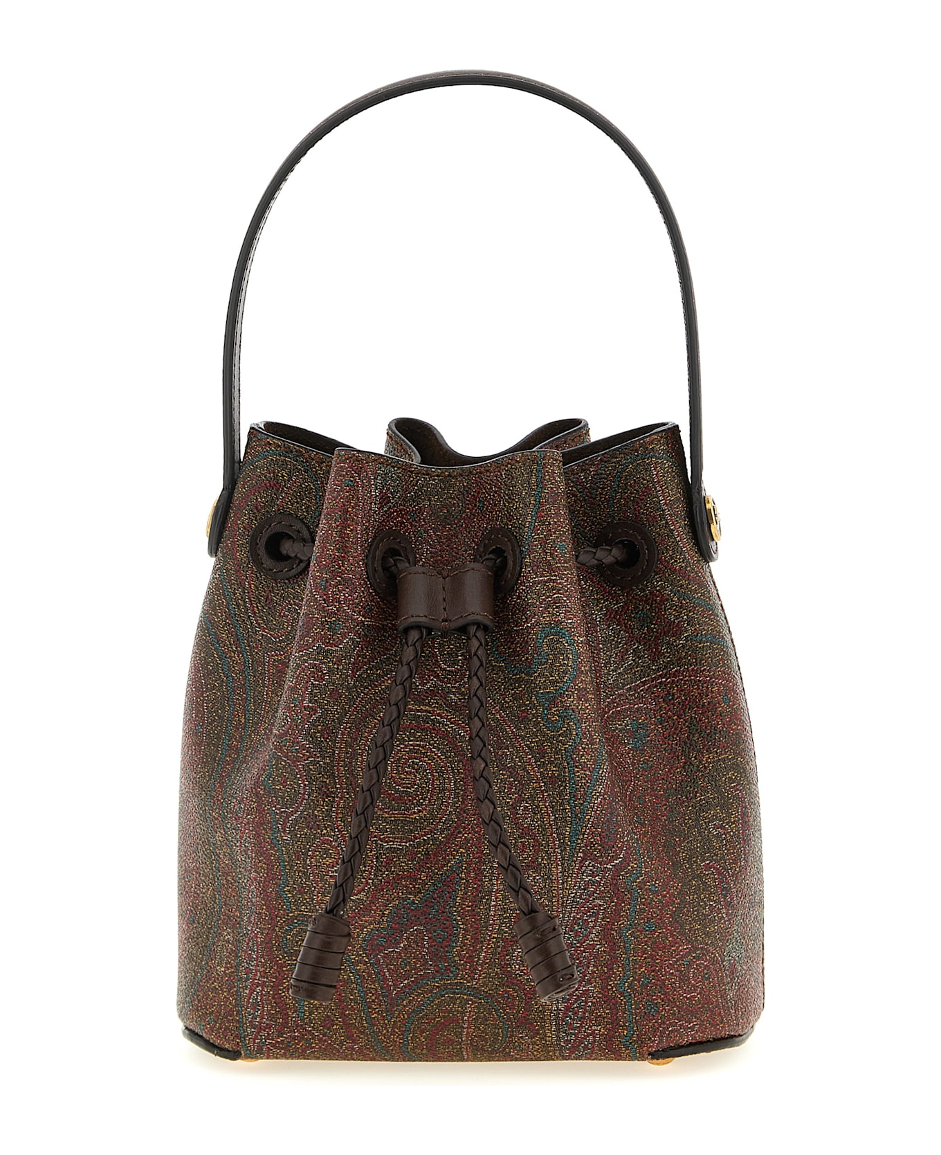 Arnica' mini bucket bag in Paisley jacquard canvas and leather, fixed handle with side metal logo, drawstring closure, rigid base with metal feet, adjustable shoulder strap. Composition: 76% cotton, 24% polyester