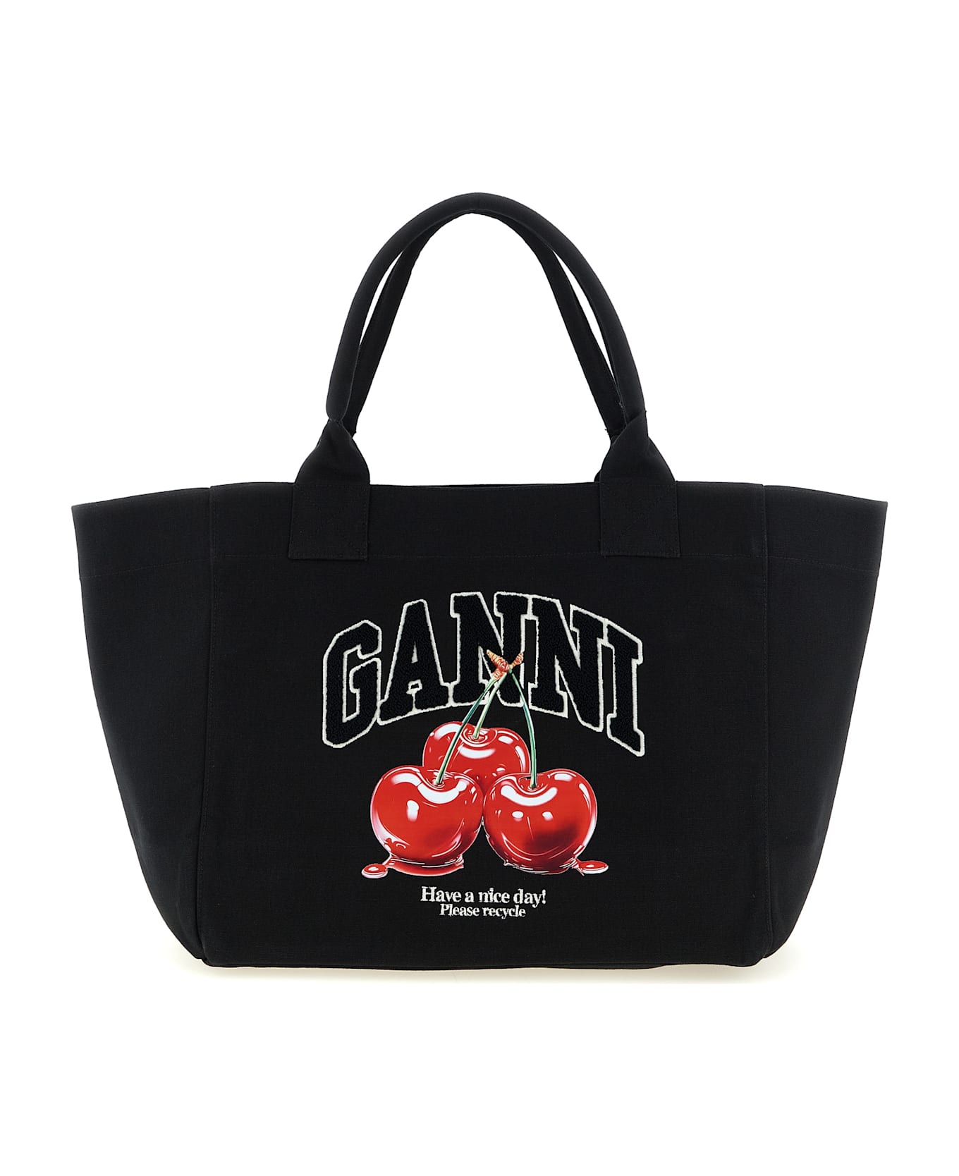 'Black Medium Cherry Tote' canvas shopping bag with front graphic print, double fixed handle. SUSTAINABLE: This product is made with recycled cotton.