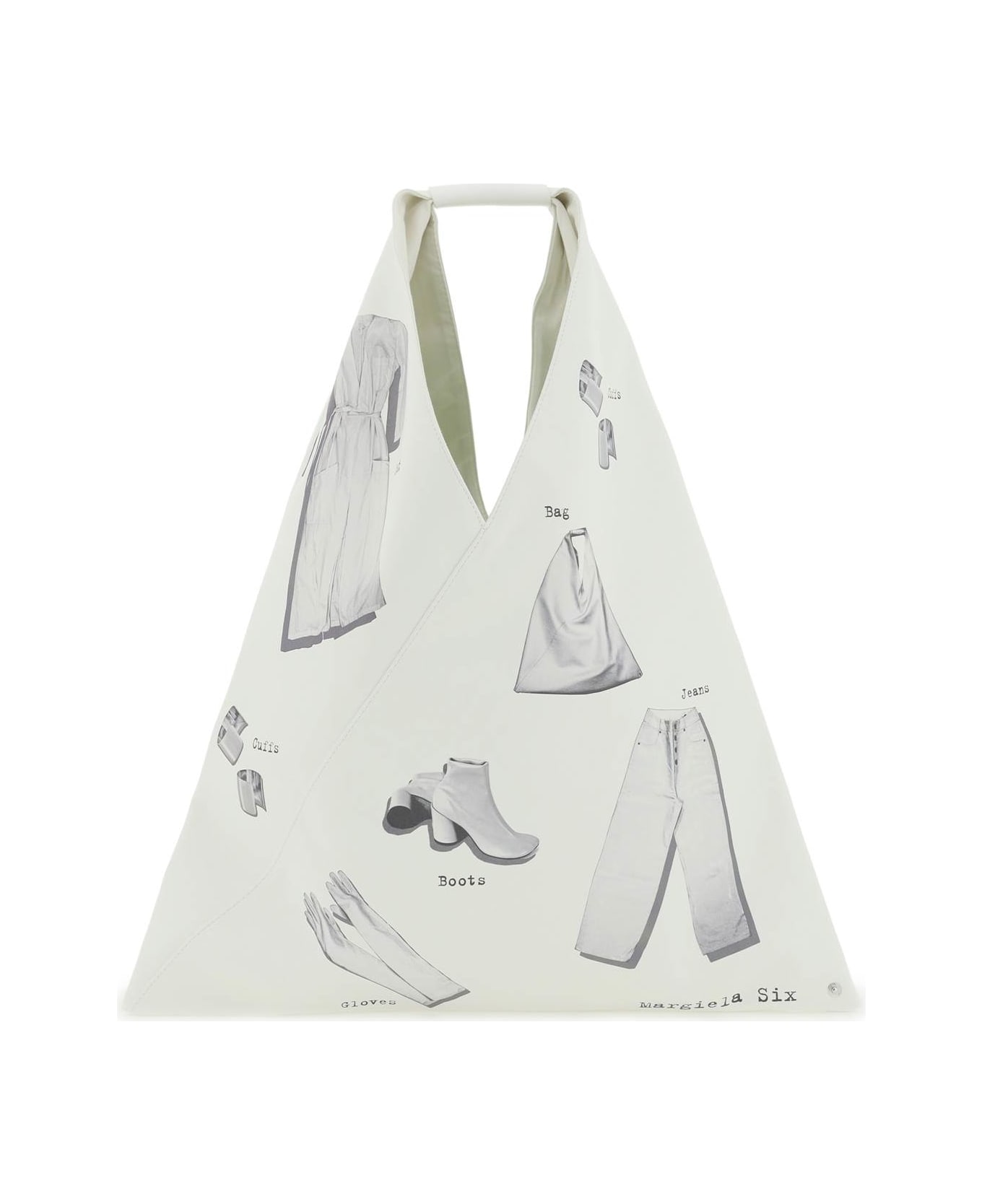 MM6 Maison Margiela Japanese bag in faux nappa leather with double triangle shape ending in the leather-wrapped top handle with debossed logo. Decorated with contrasting ready-made print all-over and characterized by iconic straight stitch on the back. Press-stud on the lower edges to change the bag shape. Press-stud closure, fabric lining, one pocket with button. Silver-finish metalware.