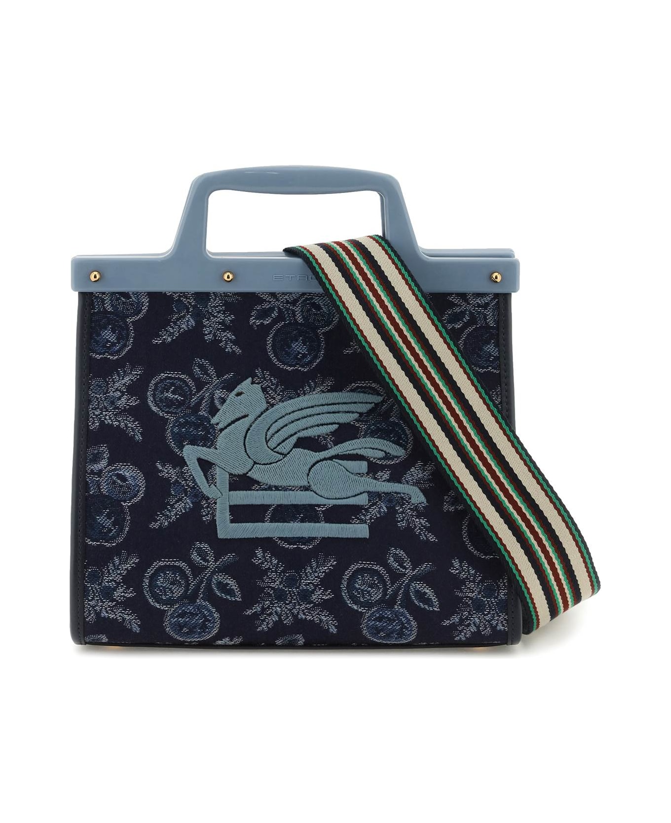 ETRO "Love Trotter" tote bag made from archive velvet jacquard with multi-coloured apples and featuring an embroidered Pegasus logo. PVC double handle, leather trim and base, lined interior with one zipper pocket and removable fabric shoulder strap. Protective studs at base and gold-finished metalware. Composition: 70% CO, 30% PL