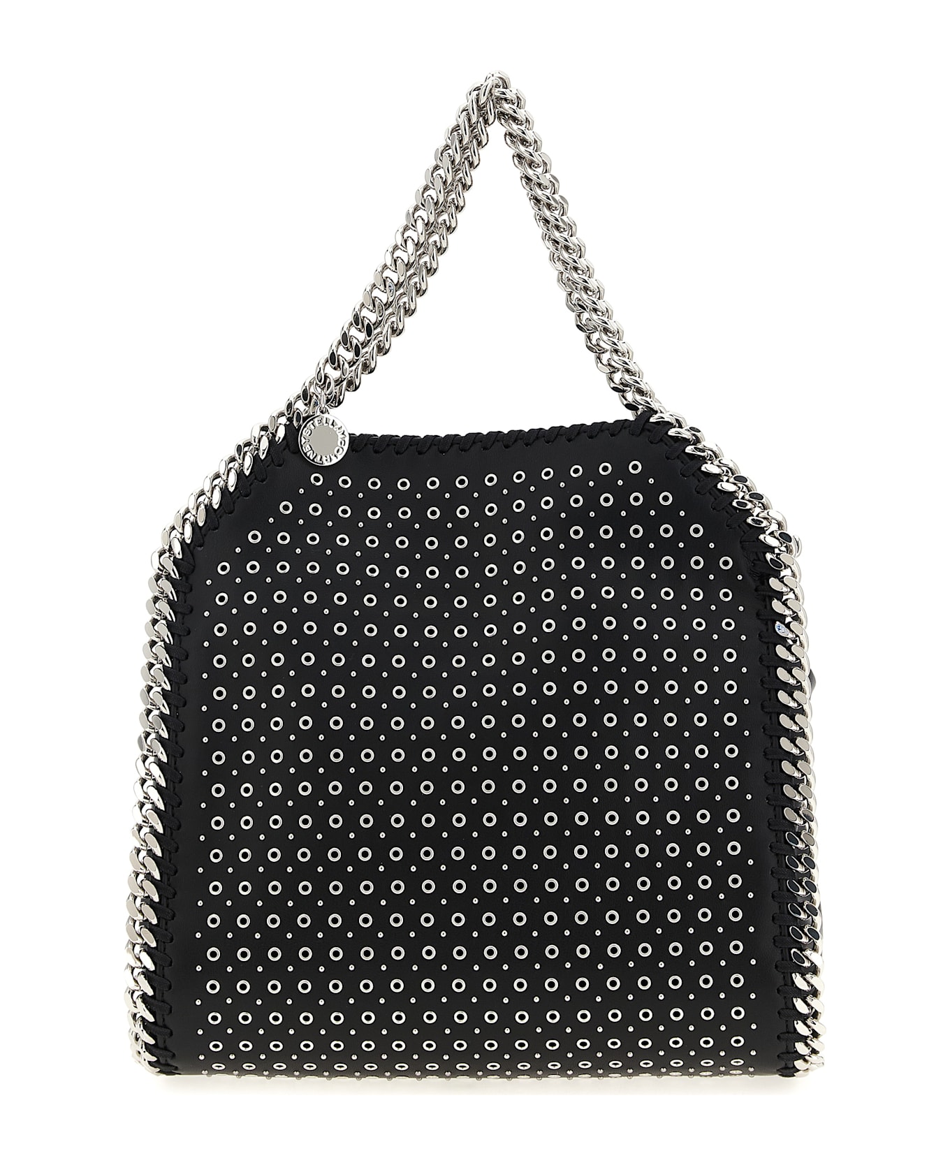 'Mini Falabella' handbag in leather-effect fabric with all-over stud appliqué, diamond-effect chain, double fixed handle, magnetic closure, chain shoulder strap, medallion charm with engraved logo. SUSTAINABLE: Products that do not use leather respecting cruelty free ethics.